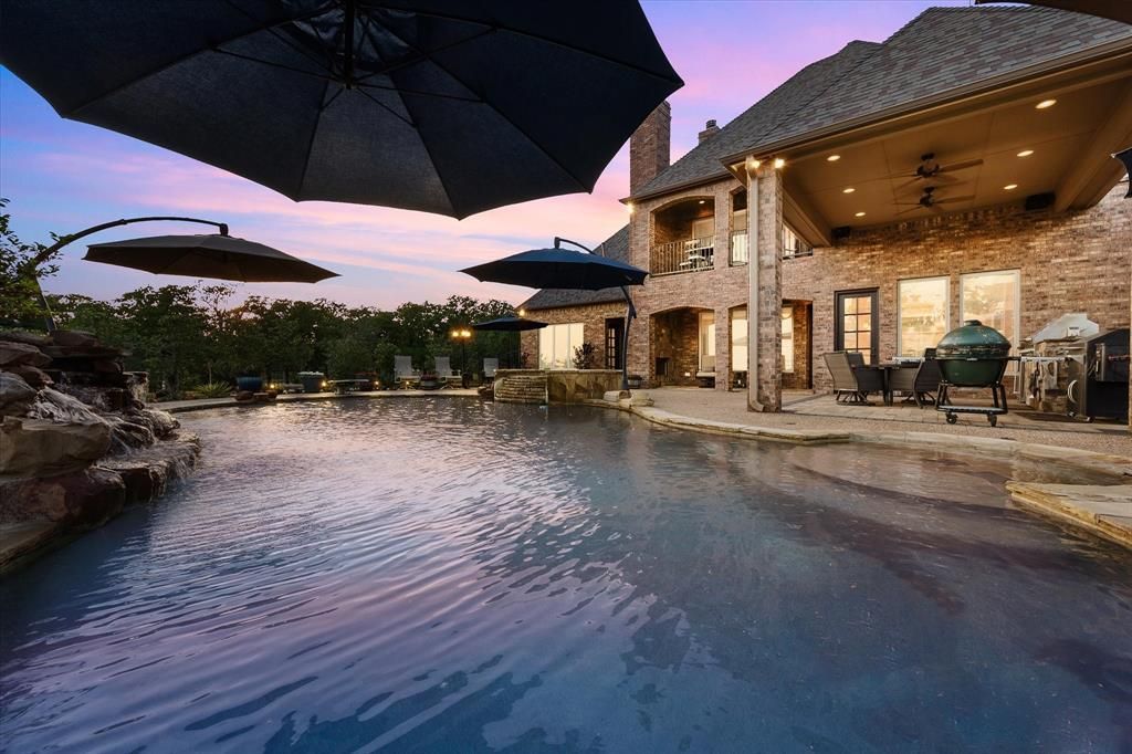 Discover a home where upgrades abound & outdoor living shines. Savor morning coffee by the patio fireplace on crisp winter mornings, entertain guests at the well-equipped outdoor kitchen, or cool off in the stunning lagoon-entry diving pool with waterfall & hot tub. Take a leisurely stroll through the park to the lakes for fishing with family, and don’t miss the breathtaking sunsets! Exquisite Craftsmanship throughout, Spanning 5,513 square feet, this 6-bedroom, 5-bathroom masterpiece offers unmatched versatility, including a private attached apartment with a separate entrance, featuring 2 bedrooms, a living area, full kitchen, bathroom, and exclusive access to the 4th garage space—ideal for a live-in caretaker, mother-in-law suite, or multigenerational living. The chef’s dream kitchen boasts top-of-the-line stainless appliances, including Sub-Zero refrigerator, Dacor 6-burner gas range with dual ovens & pot filler, quartz countertops, two large islands, two sinks, and a built-in wine cellar with butler’s pantry. Elegant finishes elevate the home, with rich hardwood floors, crown moldings, vaulted ceilings, and a striking wrought iron staircase. The spacious primary suite offers direct pool access, a luxurious bathroom with ample vanity space, and walk-in closet with impressive built-ins. Entertain in style in the upstairs theater-style media room, game room with wet bar, and cozy balcony porch. The thoughtfully designed 1st floor includes the primary and guest suites, formal study, dining room, living room, kitchen, mudroom, & 2nd private study off the laundry. Rare features provide peace of mind, including a whole-house reverse osmosis system, emergency generator, and fire sprinkler system—perfect for worry-free living, whether at home or traveling. With easy access to Highways 114 and 287, enjoy quick commutes to Fort Worth and DFW while relishing peaceful, laid-back living without the congestion. Inside and out, this home is designed to impress!