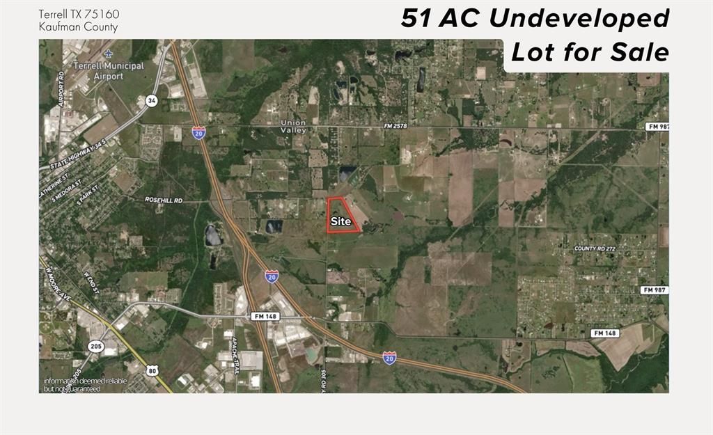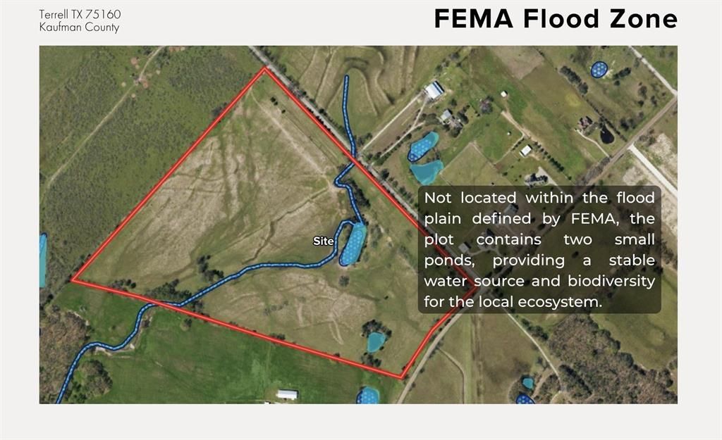 Prime development opportunity with ±51 acres of unrestricted land located within the city limits of Terrell in fast-growing Kaufman County. This tract features approximately 700 feet of frontage along County Road 304 and is situated outside FEMA-designated floodplains. The property includes two natural ponds, Ideally positioned just 0.9 miles from I-20, 3 miles from Highway 80, and 4.1 miles from Highway 34, providing excellent access to major transportation corridors. Surrounded by rapid residential and commercial growth, including high-end subdivisions, Baylor Scott & White Medical Center (1.6 miles), Terrell Municipal Airport (4.2 miles), and new industrial developments such as Blue Star Land’s 180-acre project. Utilities nearby and proximity to top-tier retail and employment centers make this an exceptional opportunity for residential, commercial, or mixed-use development.