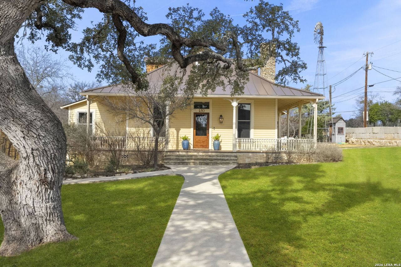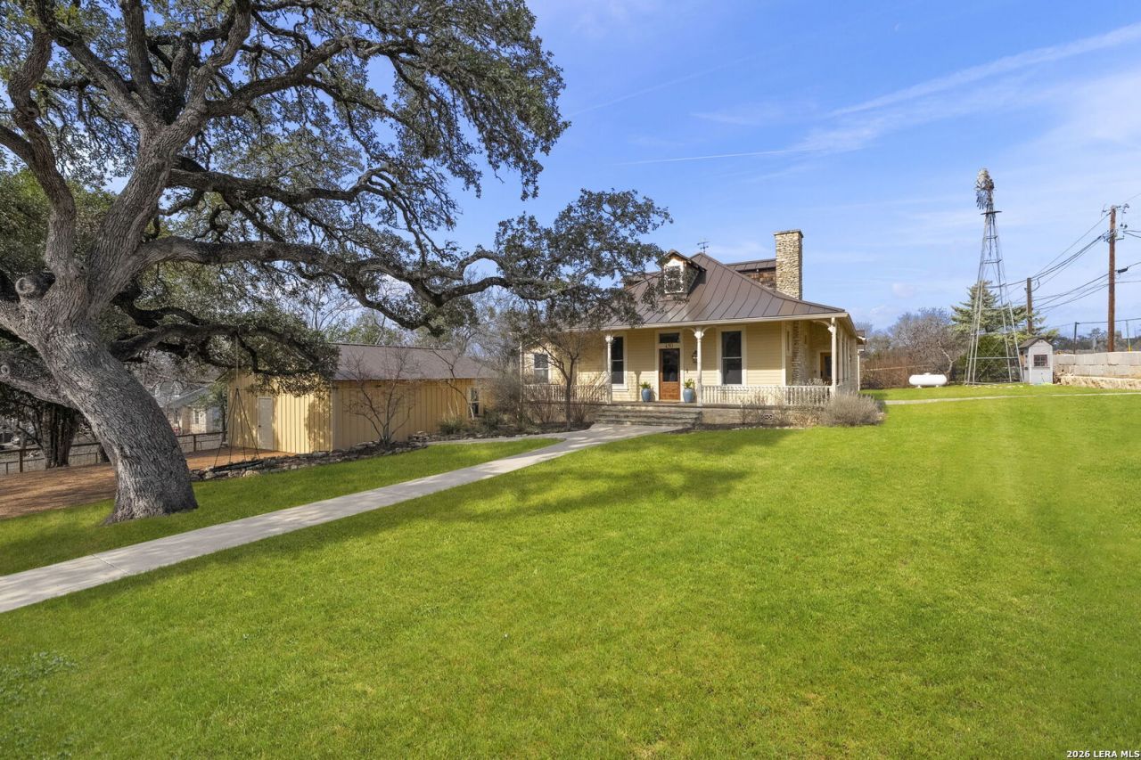 This beautifully preserved historic residence in Comfort is nestled on nearly an acre, surrounded by mature trees and timeless charm. Built in 1891 by Charles Altgelt, the home has been thoughtfully renovated to blend historic character with modern comfort. Beyond custom cut butter blocks, an electric iron gate and two pedestrian iron gates youll discover a private compound featuring the main residence, detached guest quarters, temperature-controlled storage rooms and a versatile flex space ideal for a gym or art studio. Inside, the home showcases exceptional craftsmanship and historic details including a stunning lodge-style wood-burning fireplace, original wood windows, antique doors and fixtures, stone accent walls and distressed hardwood flooring. Multiple exterior access points lead to inviting covered porches reminiscent of the era in which the home was built. The versatile floor plan offers dual living and dining areas along with a charming parlor. The island kitchen is designed for both function and style featuring a butcher block island, gas cooking, dual ovens, abundant workspace and custom cabinetry. Wraparound windows and transoms flood the home with natural light creating a warm and welcoming atmosphere. The primary suite is conveniently located on the main level and boasts a private entry, a spacious bedroom and a spa-inspired bath complete with a seamless glass shower and dual vanities. Also downstairs is a generous guest suite and a partial bath. Upstairs a third bedroom offers an en-suite bath and ample space to accommodate a king-sized bed or multiple beds, making it ideal when hosting guests. This flexible room can easily adapt to suit your needs. Outdoor living is abundant with options ranging from relaxing in rocking chairs on the front porch to entertaining on the oversized back patio. A charming pathway leads to the detached one bedroom, one bath guest quarters, currently utilized as a home office. This space offers dual entrances, one of which provides access to three climate-controlled storage rooms, perfect for seasonal decor and equipment. An additional flex space includes a pergola sitting area and a private balcony. Rich in history yet enhanced with modern amenities, this exceptional property offers the best of Hill Country living, all within walking distance of downtown Comforts boutique shopping and local dining.