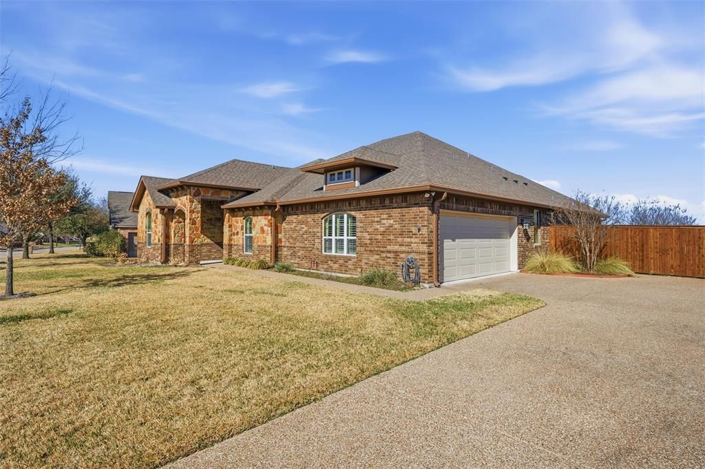 Satisfy that need for indoor-outdoor connectivity at 1108 Steamboat Drive in the Stoneridge neighborhood—an all–single-story, brick-and-stone home built for everyday comfort and easy entertaining. With 2,717 square feet, 4 bedrooms, and 3 bathrooms, the layout balances open gathering spaces with smart separation for sleeping spaces.The oversized kitchen is the true hub centered between a massive breakfast bar overlooking the dining and living areas, making it easy to stay connected. There's a generous walk-in pantry and a newer single-bowl stainless sink is ready for multiple cooks, and busy weeks. The designated dining space is flexible and large—room for a table of 10, or additional buffet or cabinet pieces, with two windows that strengthen the indoor-outdoor connection.The living room is bright, welcoming with a wood burning fireplace in one corner and a full wall of windows that pulls in natural light and frames the view of the backyard pool. Luxury vinyl plank runs through the main areas, paired with 10' ceilings for an airy feel.Out back is where this home truly shines: a swimming pool, fully fenced yard, and landscaping that enhances privacy around the pool. The covered patio includes a TV, and an extended pergola links the original patio to the pool deck—creating a seamless outdoor zone with plenty of space for outdoor cooking.The primary suite is tucked away for added privacy, featuring space for a full king-sized setup. The ensuite bath includes an oversized walk-in shower with rain glass, a corner soaking tub, and a long walk-in closet with a window for natural light. Up front, the secondary bedrooms are thoughtfully split from the primary, including one with a full bath through a private hall—ideal for office space or guests. A convenient drop spot near the side-entry garage and a laundry room with sink complete the package. Check your calendar to schedule your showing and see how effortlessly this home lives.