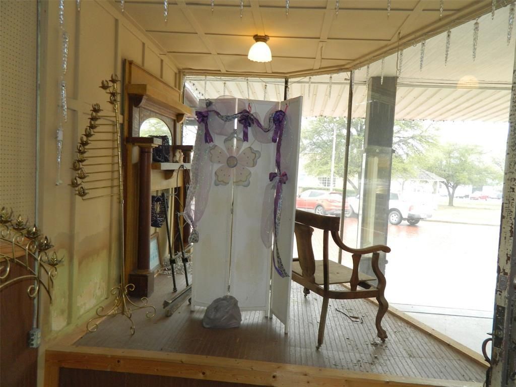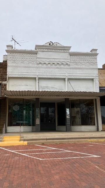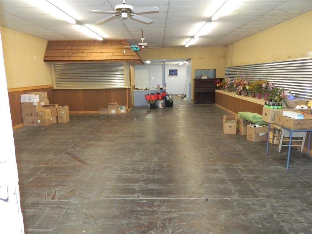 Antique building on North side of historic Leonard red brick square. Built approximately 1910-1912. Setback entrance has mirrored columns on each side of entry door and built-in showroom windows. Wood flooring was replaced and roof repair at back was done recently. Open floor plan with high ceiling in front part of building and stairs leading up to large storage upstairs. It has a large refrigerator for flowers and has been used as floral and gift shop for many years and before that it was a furniture store.
