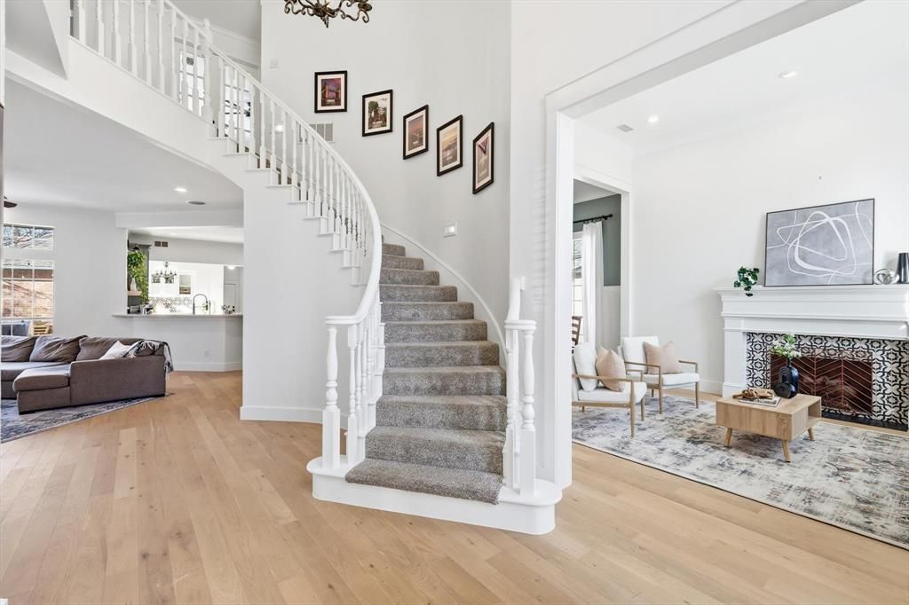 Stunning 4-bedroom, 3-bath home with a 3-car garage in a prime Coppell location. Off the foyer is a dedicated study with French doors and a closet, while to the right you’ll find the formal living room with fireplace and adjacent formal dining. White oak hardwood floors, tall ceilings, and abundant natural light enhance the main living areas throughout. The primary suite is located downstairs and features dual sinks, a walk-in shower, tub, and walk-in closet. The family room offers custom built-ins, a brick fireplace, and a wall of windows with direct access to the backyard. The kitchen is a true showstopper, completely renovated with brand-new cabinetry, Taj Mahal quartzite countertops, stainless steel appliances, and a Monogram gas range. The breakfast nook has built-in cabinets and wood accent ceiling detail. Also downstairs is a guest bedroom with adjacent full bath and a laundry room with sink. Upstairs features a game room with built-ins, two bedrooms, a fully updated Jack-and-Jill bath with new cabinetry and a beautifully tiled walk-in shower. Step outside to a backyard oasis with pool, spa, large deck, and covered patio, perfect for entertaining. Enjoy the convenience of walking to Town Center Elementary, the library, CORE Rec Center, Andy Brown Park, and so much more. Exemplary Coppell ISD schools. Easy access to highways 121, 635 and 35 and only a 15 minute drive to DFW Airport.