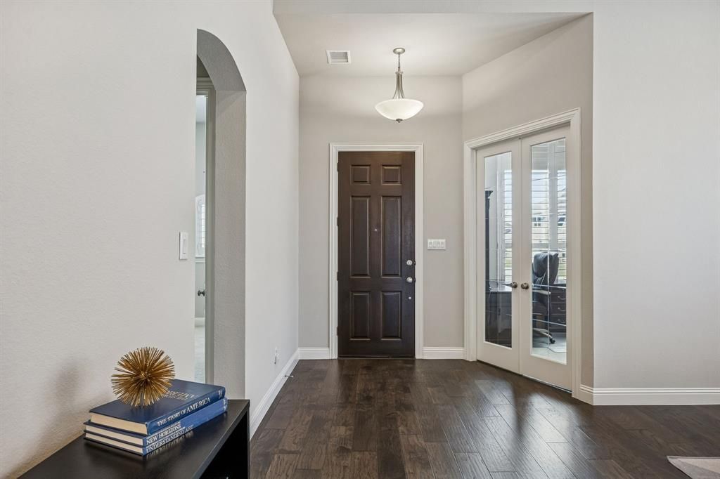 Welcome to this beautifully upgraded 3-bedroom, 2.1-bath home with a private office, located in highly sought-after Prosper ISD! Perfectly situated near major highways, premier shopping, dining, and the highly anticipated Universal Studios theme park opening soon, this home offers both convenience and an exciting lifestyle.Inside, you’ll find thoughtful upgrades throughout, including elegant 8-foot solid core doors, a home security system, whole-home surge protection, and energy-efficient solar attic vents. The spacious living room features built-in surround sound that extends to the patio—perfect for entertaining indoors and out. The private office provides an ideal space for working from home or a quiet retreat.The garage offers extra storage space, giving you the functionality you need without sacrificing style.Located within a well-maintained HOA community, residents enjoy exceptional amenities including scenic walking trails, parks, playgrounds, a resort-style pool, and a splash pad—something for everyone to enjoy year-round.This home truly combines comfort, upgrades, and an unbeatable location. Don’t miss your opportunity to own in one of the most desirable areas of Frisco!