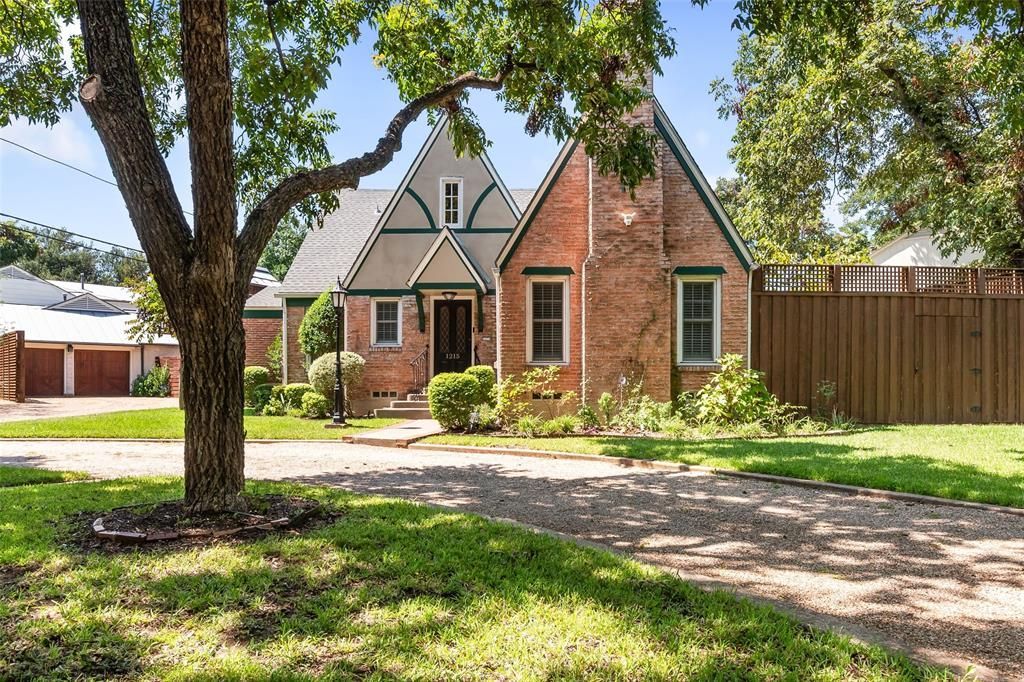 Steeped in the quiet theatricality of Tudor architecture, this storybook home blends historic beauty with thoughtful updates for modern living. Its steep gables, decorative half-timbering, and sculptural brick chimney create a striking first impression, while leaded-glass windows cast soft patterns of light across the interior. Traditional ceiling heights and cozy, intimate rooms offer the kind of warmth and connection that many homeowners now seek—spaces that feel personal, calm, and deeply livable. Inside, hardwood floors and two gas-log fireplaces ground the living areas in classic charm. The main-level primary suite provides ease and privacy, while the expansive, updated kitchen serves as the home’s centerpiece, featuring a generous island, granite counters, marble backsplash, built-in refrigerator and freezer, beverage fridge, and custom glass-front cabinetry. The adjoining four-season porch, with its own HVAC system and French doors, offers year-round enjoyment and a serene connection to the outdoors.The den—ideal as a library or creative workspace—reveals floor-to-ceiling windows, a wall of custom bookshelves, and a fireplace that encourages quiet moments of discovery. Upstairs, angled ceilings follow the home’s Tudor rooflines, and the updated bath includes a clawfoot tub beneath a vaulted, beamed ceiling, separate shower, and dual period-style vanities. The main level primary bath adds modern comfort with heated floors.An electric gate leads to the garage with workshop and a private backyard oasis. A winding stone path and mature landscape create an atmosphere of uncommon beauty. For the next caretaker, opportunities exist to modernize according to personal taste while honoring the home’s enduring character if desired. With a whole-house 20 kW generator and easy access to Stevens Park Golf Course, Bishop Arts, airports, dining, and downtown Dallas, this home offers a rare blend of romance, practicality, and architectural intention.