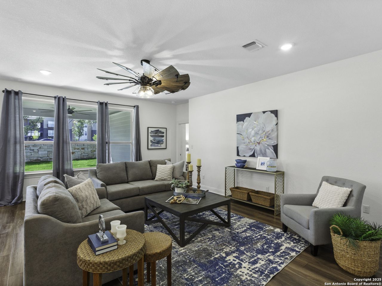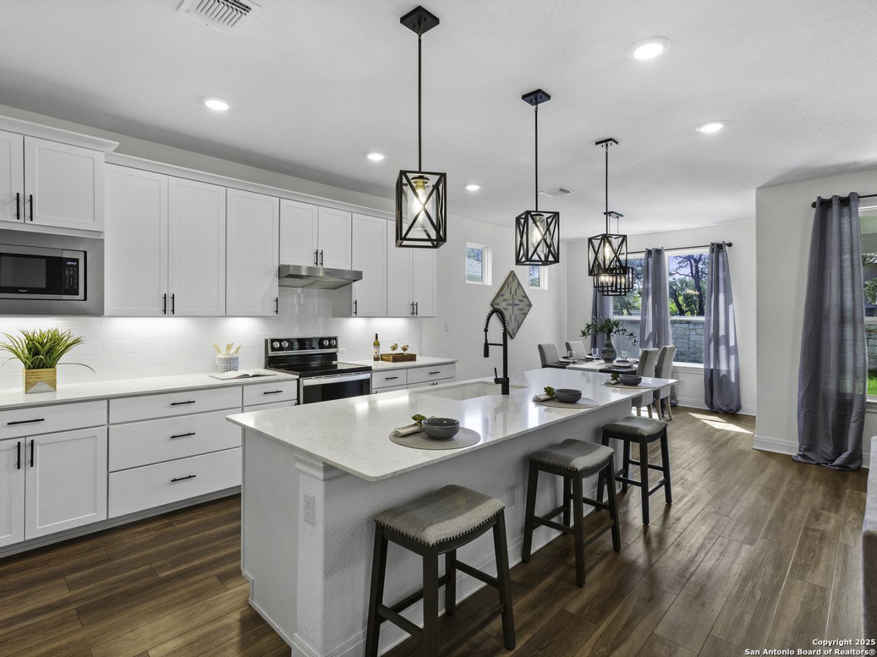 Live the Texas Hill Country lifestyle in this beautifully appointed home in Georges Ranch, one of Marble Falls premier master-planned communities. Just minutes from historic downtown and with quick access to Lake LBJ, this location offers the ideal blend of scenic tranquility, small-town charm, and everyday convenience. Georges Ranch is known for its wide Hill Country views, thoughtfully designed amenities, and easy proximity to top-rated schools, medical services, restaurants, shopping, and outdoor recreation-including boating, fishing, wineries, golf, and miles of trails. Positioned directly across from the neighborhood playground, the home sits in an exceptional location for family-friendly living. A welcoming covered front porch, framed by flowerbeds and lush landscaping, leads into an open-concept layout filled with natural light. The spacious living area flows seamlessly into a gourmet kitchen designed for both daily comfort and entertaining. Quartz countertops, a classic white subway tile backsplash, soft-close cabinetry, under-cabinet lighting, and a large walk-in pantry deliver the style and function todays buyers expect. Enjoy meals in the dining area or take gatherings outdoors to the covered back patio with ceiling fan and views of mature shade trees and a stone privacy wall. The owners suite offers a quiet retreat, featuring oversized windows and a spa-inspired bath with soaking tub, walk-in shower, and dual walk-in closets. Smart planning continues throughout the home with multiple storage closets, a built-in drop zone at the garage entry, and a Murphy bed that provides flexible guest or office space. Outside, the treed backyard enhances privacy and creates a peaceful setting for year-round enjoyment. Residents of Georges Ranch enjoy access to outstanding new community amenities, including a resort-style pool, pickleball courts, an amenity center, and shaded outdoor gathering areas. Combined with the natural beauty of the Hill Country and the vibrant local culture of Marble Falls-farmers markets, lakefront activities, dining, festivals, and an easy drive to Austin-this home delivers exceptional quality and value. Move-in ready and positioned within one of Marble Falls most desirable neighborhoods, this property is an opportunity not to be missed.