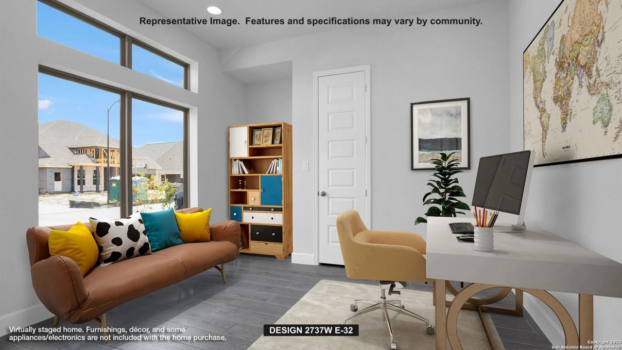 Home office with French doors set at entry with 12-foot ceiling. Game room with French doors off extended entry. Family room with a wood mantel fireplace and wall of windows opens to kitchen and dining area. Kitchen features walk-in pantry, two wall ovens, 5-burner gas cooktop and generous island with built-in seating space. Primary suite includes bedroom with wall of windows. Double doors lead to primary bath with dual vanities, garden tub, separate glass-enclosed shower and oversized walk-in closet. A guest suite with private bath adds to this four-bedroom home. Extended covered backyard patio. Mud room off the two-car garage.