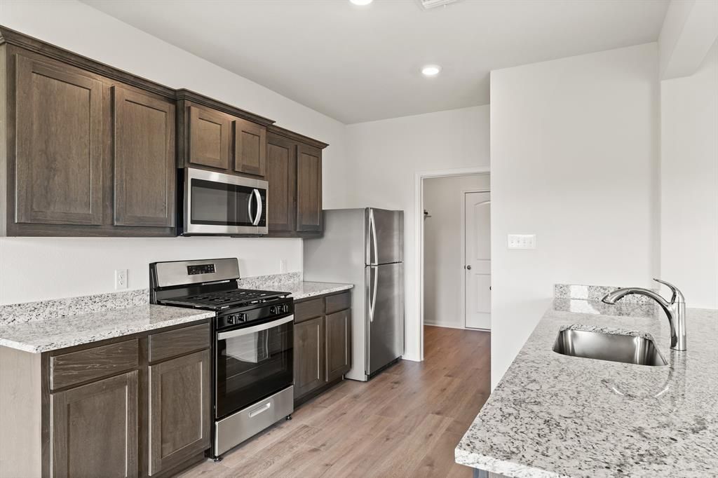 The two-story Cypress boasts four bedrooms, two-and-a-half bathrooms and an attached two-car garage. The kitchen features wood cabinets, granite countertops and stainless-steel appliances, with an adjacent dining room perfect for family meals. With a seamless flow between the kitchen, dining and family rooms, the spacious living areas offer room for entertaining, from football watch parties to cozy movie nights. The downstairs master suite includes a bedroom, bathroom and walk-in closet. Upstairs, the secondary bedrooms each have walk-in closets, providing additional storage. Other storage options, including a spacious pantry, numerous cabinets and linen closets, are also spread throughout the home for extra storage and organization.