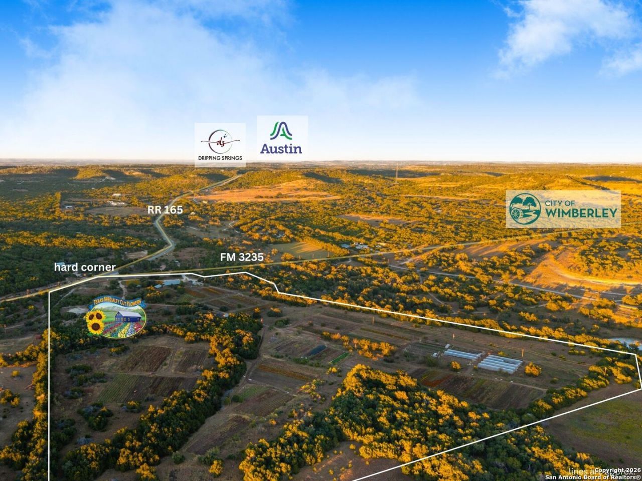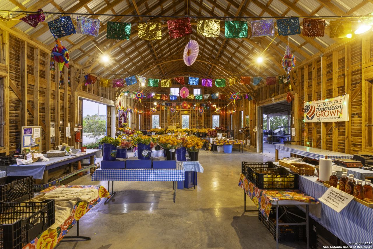 Arnosky Family Farms is a rare 60 acre property in the heart of the Texas Hill Country-an established Blanco County flower farm with deep community roots. Positioned with roughly 900 feet of combined frontage at the corner of RR 165 and FM 2325, it offers strong visibility and significant commercial potential while still feeling like a peaceful working farm. The property has been featured in Southern Living, Texas Highways, and other publications. Location: ~10 minutes to Blanco, ~20 minutes to Dripping Springs, and ~45 minutes to Austin. Land/Operation: Long operated as a Certified American Grown flower farm with deep, cultivated soils, production greenhouses, orchards, and paper shell pecans; appr 20 acres in active cultivation and ~40 acres of open green space. Diverse habitat with hardwoods and signature live oaks, multiple paddocks, and abundant wildflowers along an old rock wall. Per seller, land has been farmed for 150+ years and was part of the historic Peyton Colony. Improvements: The "Blue Barn" (~30 60) with broad rear porches overlooking the fields, plus a stage and excellent acoustics; adjacent ~24x40 pavilion strung with lights for markets, tastings, weddings, and gatherings. Utilities in place across the acreage. Seller reports no restrictions; buyer to verify. Use potential includes continued agriculture, event/hospitality, tasting room concepts, boutique lodging, restaurant, private estate/compound, or a blend of uses (subject to buyer due diligence). Shown by appointment only. Buyer to verify all information including utilities, restrictions, acreage, and development feasibility.