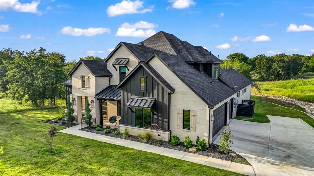 Completed in 2024, this 5 bedroom, 2 level waterfront home is the epitome of contemporary sophistication. Constructed and designed with a modernized style, the residence exudes a harmonizing balance between stylish esthetics and timeless appeal. Intelligent design allows for perfect functionality, offering tall ceiling heights, wide hallways, windows from every position, a private primary suite within its own wing of the main floor, a flex office or 5th bedroom, and an upper level media room adjacent to 3 guest bedrooms. The interior is filled with recessed LED lighting throughout, while the exterior offers motion sensor night lights and photo cell exterior sconces, creating an inviting and well protected property. The backyard is spacious, secluded and serene, with a canopy of trees acting as a gateway to the neighboring pond. A large 2 car garage with a 3rd bay for golf cart, ATV, etc, compliments the home, as well as multiple storage spaces. This half acre property lies within the well known Reserve at Sugartree, a gated, secure community nestled within a beautiful golf course, amidst ponds and natural terrain, with its own association outdoor pool. 15 minutes to Weatherford via a peaceful, countryside drive, with Brock schools only minutes away as well.