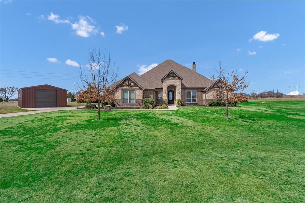 2 ACRES OF PRIVACY.INGROUND GUNITE POOL AND SPA.SHOP WITH ELECTRIC AND INSULATED.ONE STORY OPEN FLOORPLAN.NO WATER BILL...Custom built one story home on 2 acres nestled on a cul de sac featuring 4 bedrooms, 3 baths, a gameroom, 3 car garage, plus a 20x30 insulated shop with electric, heated inground gunite pool and spa, outdoor covered patio with wood burning fireplace. The oversized kitchen offers granite countertops, large island, farmhouse sink, pot filler, double ovens, gas stove, walk in pantry, and travertine backsplash. Handscraped hardwood floors highlight the main living areas with wood beams, crown molding, and a floor to ceiling stone fireplace in the living room. The private primary suite features coffered ceilings, and a spa like atmosphere featuring a custom oversized shower with a separate bath, along with an oversized primary closet. Additional upgrades include 2 inch wood blinds, framed windows, 20 inch tile in wet areas, and a striking 9 foot iron front door. Fresh landscaping completes this move in ready acreage retreat.