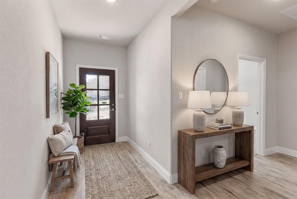 Welcome home to comfort, privacy, and convenience in Pioneer Valley in Howe, Texas. Built in 2022 by a custom home builder, this thoughtfully designed 3-bedroom, 2-bath home offers 1,706 square feet of modern living with a layout that truly works. The split-bedroom floor plan places the primary suite at the back of the home, creating a quiet retreat separate from the secondary bedrooms. Inside, wood-look tile flooring in the main living areas provides both style and durability. The open kitchen anchors the home with a large granite island, a stainless steel electric range, a built-in microwave, a dishwasher, and generous counter space for cooking and gathering. The oversized utility room adds everyday practicality with space for hanging clothes and additional storage. The primary suite features dual granite vanities, additional wall of storage shelving, and a spacious walk-in shower with built-in seating. Secondary bedrooms are well-sized and share a full bath with granite countertops. Built on a piered slab foundation and insulated with spray foam, this home was constructed with energy efficiency and structural integrity in mind. Step outside to enjoy the covered back patio overlooking a privately fenced yard with irrigation and established landscaping. While the winter season limits views of the gardens, the thoughtful design and plantings will come to life in the warmer months.