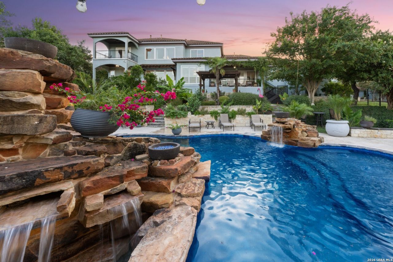 Impressive Hill Country retreat, featuring 8.64 unrestricted acres, delivers privacy, views, and a seamless blend of luxury and comfort. A private drive winds up a gentle hill and opens to this magnificent estate. Inside, the gourmet kitchen is well appointed with top-of-the-line Italian appliances, custom cabinetry, and a generous granite island for gathering and entertaining. The primary suite is on the main level and boasts a spa-like en-suite bath with a deep soaker tub, 2 sinks, a glass shower and a large walk-in closet. A media room, office and laundry complete the main level, while the upstairs offers 4 large bedrooms, 2 full baths, and a balcony overlooking the elevated backyard. The outdoor living space unfolds as beautifully curated retreat with a heated beach-entry pool and spa, a slide, a rock cove, an outdoor fireplace and multiple grilling stations. Separate living quarters above the 3-car detached garage. Served by award winning Comal Independent School District and zoned to Smithson Valley High School. Minutes to Boerne, New Braunfels, Gruene and the San Antonio International Airport. No HOA.