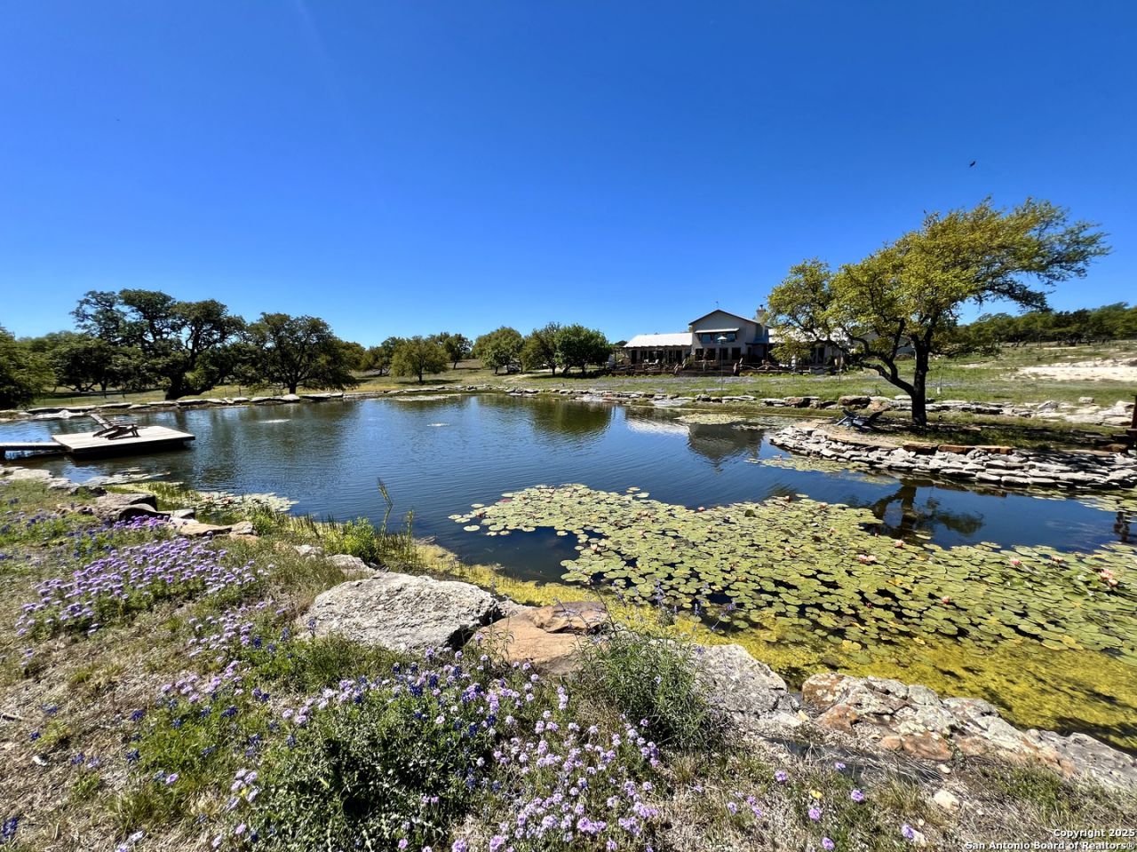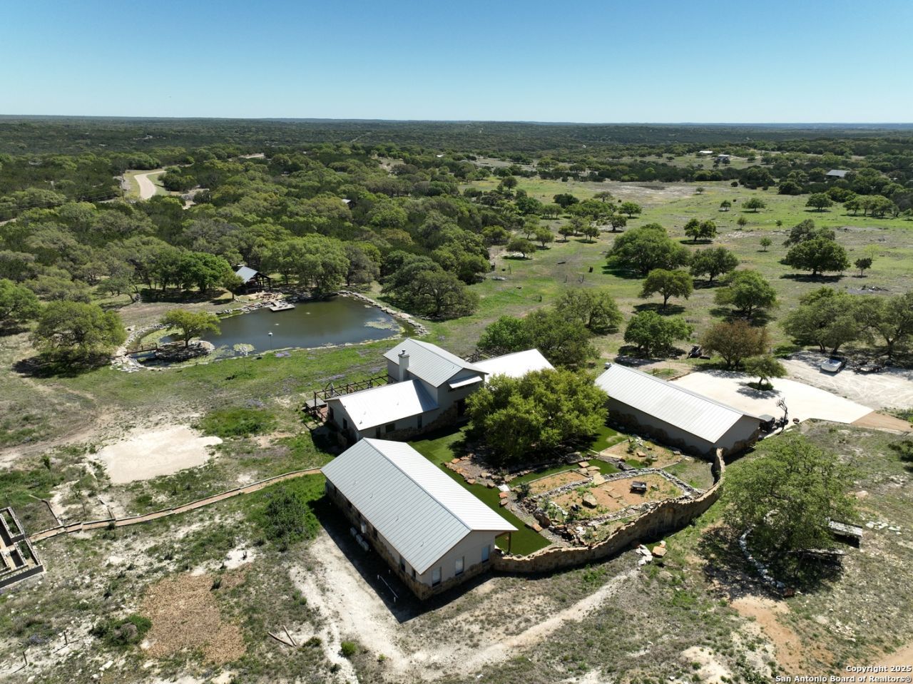 Luxury + seclusion go hand-in-hand on this finely improved ranch. Striking main house connects by lush garden to guest house. Great privacy with home + guest suites totaling 6 Br, 6.5 Baths. Home 2 Br/2.5 Baths. 3 guest suites have kitchenettes, baths & courtyard access. Half-acre pond has island, dock + 2nd pond. 2 water wells. Gazebo & firepit. 5-car garage. Guest/staff cabin. Highfenced garden. Fenced/ crossfenced. Native & free ranging exotic wildlife, bass, waterfowl. Owner will sell improvements on 20 AC.
