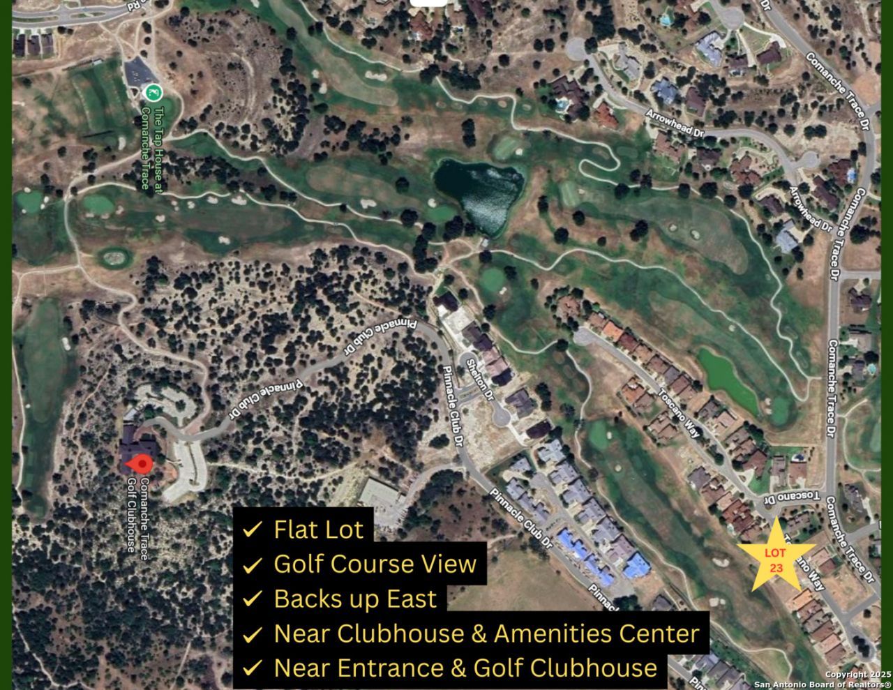 Welcome to Comanche Trace, a premier 27-hole championship golf community where luxury meets lifestyle. This spacious lot at 2041 Toscano Way offers the perfect setting to design and build your custom Hill Country retreat. Tucked in the heart of the community, youll enjoy access to a private Guadalupe River park, a stocked fishing lake, scenic walking trails, a community garden, and more. Optional golf and social memberships open the door to resort-style amenities and connections with neighbors. Just minutes from downtown Kerrville, this homesite blends tranquility, convenience, and the opportunity to create your dream home in a sought-after location.