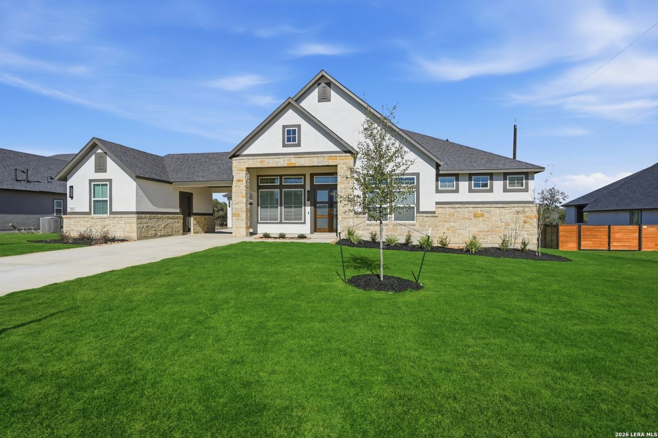 Move in Ready! Sitting on a green belt, Our newest one-story floor plan, the Gregory! This home is for those who share a love of cars because this plan has made extra car storage possible! The home itself continues to showcase popular features such as vaulted ceilings, a huge kitchen island, an area that opens up to the family and dining area, an outdoor patio to give you views of the hill country, and much more! With 4 bedrooms, 3 and a half bathrooms, a flex room, formal study, and even a tech center, you have plenty of space to entertain family or work from home.