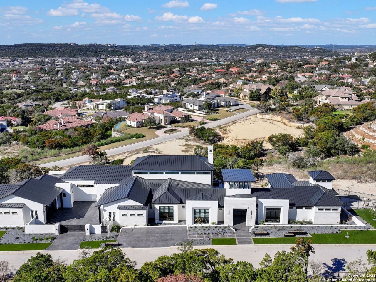 A striking transitional estate positioned along an exclusive cul-de-sac street within The Dominion, offering spectacular panoramic views and exceptional privacy. Walls of floor-to-ceiling glass fill the interiors with natural light, accentuating the homes remarkable craftsmanship and curated finishes. Designed on an impressive scale with soaring ceilings and verdant vistas, the interior showcases European white oak floors, smooth-finish walls, architectural ceiling details, designer lighting, and exquisite stone and marble selections throughout. The chefs kitchen features professional-grade stainless steel appliances and an oversized island that opens seamlessly to the family room, where soaring two-story ceilings and a stone-clad gas fireplace create an atmosphere of grandeur and warmth. The primary suite is a true sanctuary, offering patio access for morning coffee or evening relaxation, dual spa-like baths with separate vanities, and two custom-fitted closets with glass display cabinetry. Three spacious guest bedrooms each feature en-suite baths, while an expansive game room with a full wet bar provides an ideal setting for entertaining. Outdoors, a large covered patio with a full kitchen overlooks the resort-style pool and spa framed by sweeping Hill Country views. A four-car side-entry garage with epoxy-finished floors is complemented by an additional two-car garage and generous guest parking. Every element of this residence reflects thoughtful design and timeless luxury.
