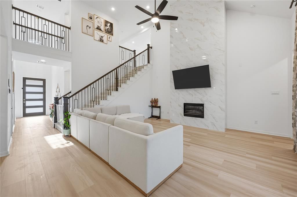 LIKE-NEW and IMMACULATE 2-STORY with an AMAZING FLOOR PLAN! This home makes a stunning first impression with a modern front door, recently installed luxury plank flooring, soaring ceilings, abundant windows for natural light, 6-panel doors downstairs, 5-panel doors upstairs, an open-concept floor plan, and a split-bedroom layout. Host memorable gatherings in the spacious family room graced with an impressive floor-to-ceiling fireplace, or prepare meals in the chef’s kitchen boasting quartz countertops, stainless steel appliances, an island with a breakfast bar, and a pantry. After a long day, unwind in the secluded primary suite showcasing a tray ceiling, soaking tub, separate shower, separate quartz vanities, and walk-in closet. Entertain family and friends in the huge game room, or watch hit movies in the private media room. Enjoy the outdoors in your large backyard offering a covered patio and plenty of room to play. Residents have access to a community pool, park, and playground. HOA dues include front yard maintenance. Close proximity to Alliance Town Center, with easy access to 35W, 377, and downtown Fort Worth. Move-in ready and effortlessly stylish, this home is designed for comfort, livability, and ease. Take a first-person look at this gorgeous home! Click the Virtual Tour link to see the 3D Tour!