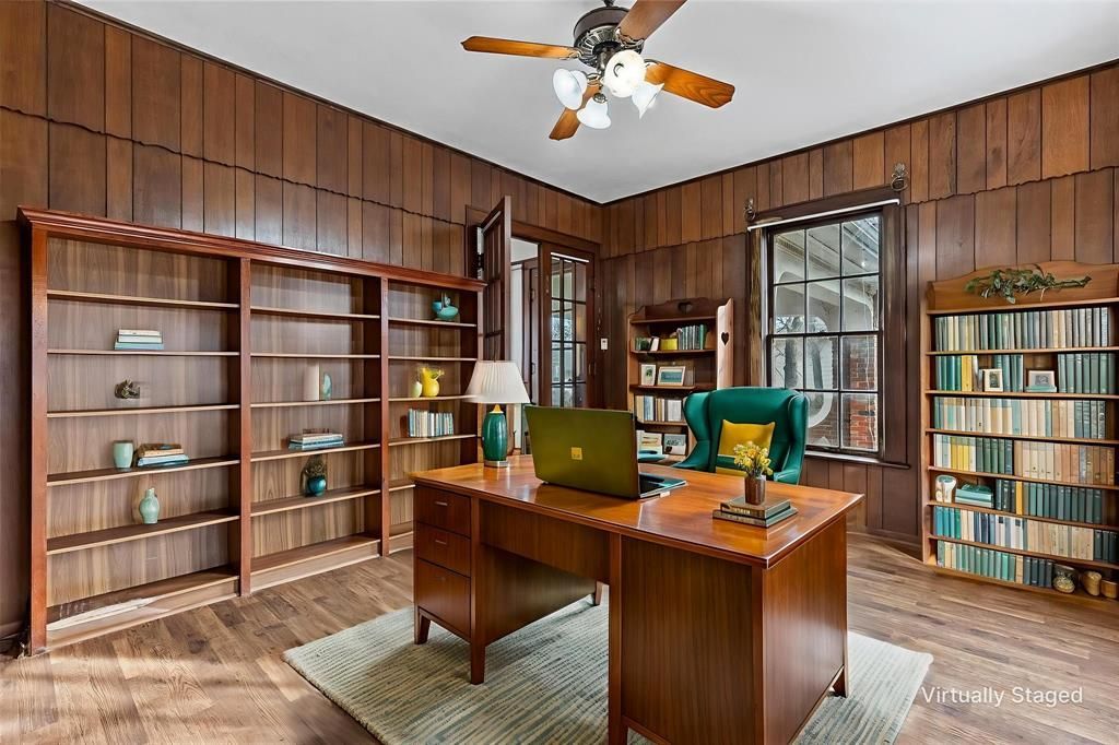 Discover a timeless treasure filled with character and classic details. Built in 1917, this charming home offers the solid foundation and inviting spaces needed to transform it into your dream residence. Step inside to a welcoming foyer highlighted by beautiful stained-glass artwork. From there, admire the stunning original wooden staircase or settle into the generously sized living room featuring a warm wood-burning fireplace; perfect for cozy evenings at home. Looking for a private workspace or reading retreat? You'll love the large study, complete with built-in bookshelves ready to be filled with your favorite reads. The kitchen is fully equipped with everything you need: refrigerator, 5-burner stove with warmer, microwave, and dishwasher. A cozy sunroom, convenient half bath, and a laundry room complete the first floor.Upstairs, you’ll find four spacious bedrooms, each with closet shelving already in place, plus a large bathroom featuring a built-in vanity, shower-tub combo, and a separate private water closet.Need more room to grow? The home also includes a basement and detached garage, offering additional space for hobbies and storage. Outside, enjoy a large fenced backyard, already cross-fenced and ready for pets, gardening, or play.This historic home is full of charm, character, and endless potential—ready for its next chapter!