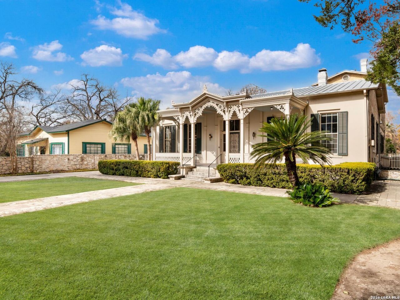 An extraordinary opportunity to own a distinguished residence on one of the most coveted streets in San Antonio. Situated in the prestigious King William Historic District, this remarkable property offers an unparalleled lifestyle where architectural heritage meets refined living. Set among stately, tree-lined streets, the home showcases grand proportions, soaring ceilings, intricate millwork, and exquisite original details that reflect its timeless character. Expansive windows flood the interiors with natural light, accentuating the homes elegant craftsmanship and thoughtfully designed spaces. The gourmet eat-in kitchen serves as both a culinary showpiece and gathering space, appointed with double ovens, a fireplace, and a wet bar, ideal for elevated entertaining. Two luxurious en-suite bedrooms on the main level provide comfort and privacy, while multiple formal and informal living areas offer seamless flow for hosting on any scale. Beyond the interiors, the gated grounds create a private sanctuary. A resort-style pool and sophisticated lounge area overlook the river, delivering a serene backdrop rarely found in an urban setting. Enjoy effortless access to the San Antonio Rivers scenic trails, Southtowns acclaimed dining and cultural destinations, Downtown, premier shopping, and major expressways. This is a rare offering that embodies historic grandeur, modern sophistication, and an exceptional standard of living.