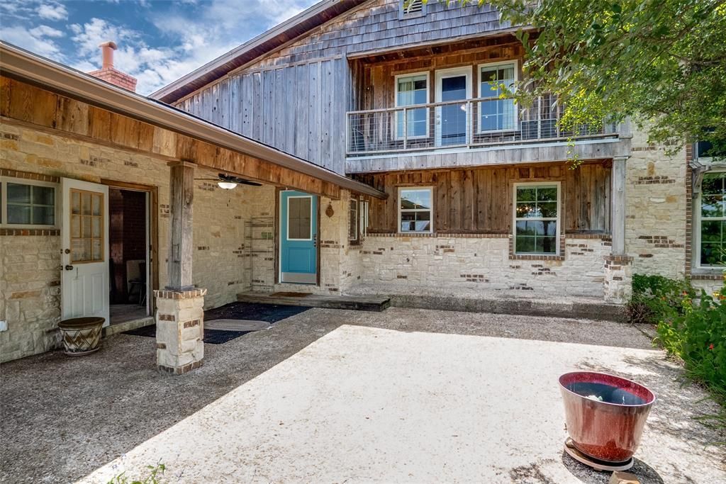Driving down the long driveway, you are surrounded by lush green nature and native pecan trees lining the drive up to the house, where you will find all the farmhouse charm a person could want. The house was completely renovated in 2014 by Robert Harper. The millwork is amazing and adds tons of charm. Much of the original wood was reused in the remodel, adding to its authentic farmhouse allure. The entry opens to the original 1950’s built home and has the original oak hardwood floors. A large dining room greets you and boasts a wood burning fireplace with an antique mirrored mantlepiece. The expansive kitchen is equipped with honed black granite countertops, custom cabinetry, a 5-burner stove, a counter depth French door refrigerator and a large farmhouse sink. There is a large walk-in pantry and a desk station ideal for a home office. The living room has 16 ft ceilings and a fireplace faced with old Chicago brick and a mantle built from a timber taken from the old jail once located down the street. There are 4 bedrooms and 2 baths downstairs. Upstairs, the primary bedroom suite boasts a balcony overlooking the property, a beautiful bathroom with a garden tub, and loads of storage. The back entry features a herringbone wood floor from Bois d’Arc blocks that formed the floor of the original Warehouse Theater location. The backyard patio is surrounded by beautiful flower beds and two Elm trees providing afternoon shade to the house. A large metal clad barn is a must see with insulated and air-conditioned space as well as workshop and the remainder is perfect for storage or animals. A huge loafing shed is attached. Electricity (including a 220 service) is provided by a separate line and meter. The pastures are native grass and have yielded 24-40 large round bales twice yearly. There are 2 sizable tanks and 2 wells. There are many native pecan trees throughout the property, the largest 50 feet tall. 2025 updates include new $21,500 30 yr roof and $10,500 new septic.