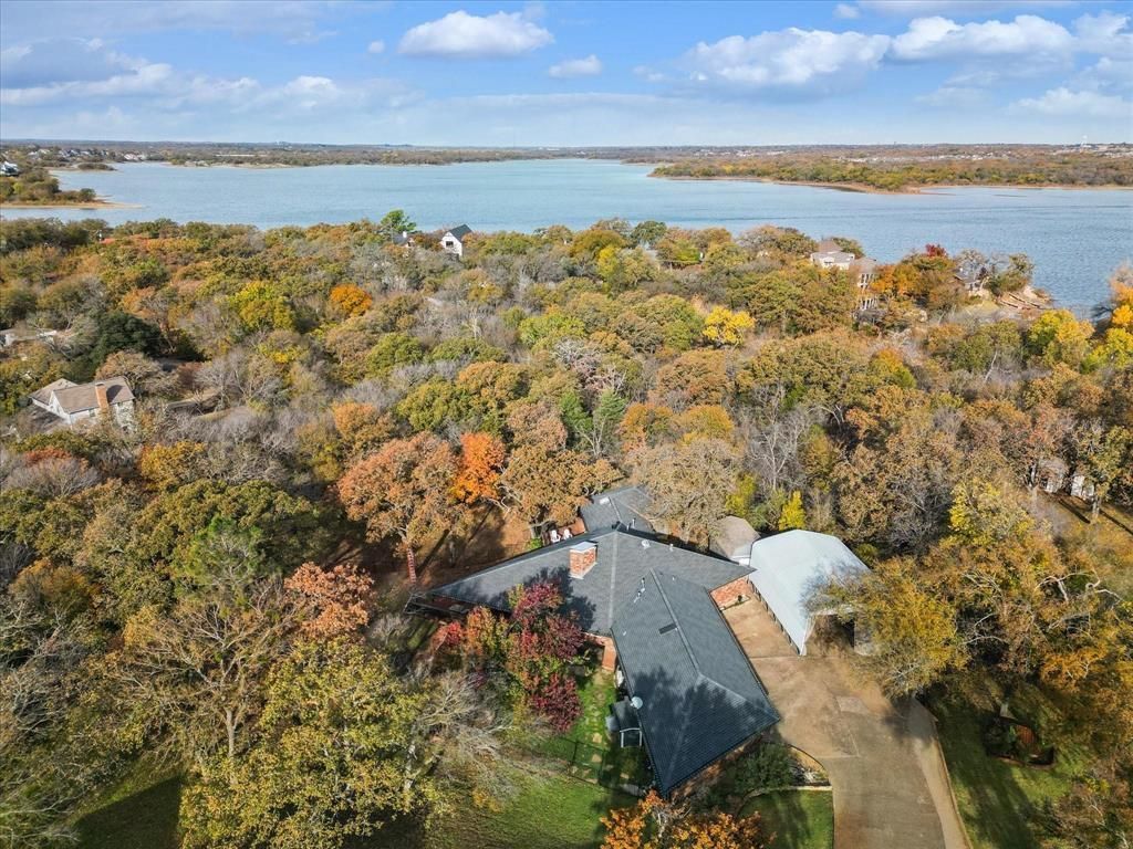 Situated on one of the most sought-after streets in Highland Village and sitting on over 1 acre, this heavily treed property offers privacy, versatility, and lake lifestyle living just moments from Lake Lewisville. Backing directly to protected U.S. Army Corps of Engineers land, the home enjoys uninterrupted wooded views and lasting seclusion. Expansive rear windows flood the vaulted living spaces with natural light, while dramatic brick feature walls, rich wood flooring, and a statement fireplace create a warm, lodge-inspired atmosphere. The open living and dining areas are designed for both everyday comfort and entertaining. A private well system supports the landscaped yard, and the fenced backyard and side yard provide additional functionality. Exceptional storage and parking options include a 1-car garage, 36 x 26 (936 SF) metal carport ideal for boat or RV storage, 16 x 17 (272 SF) detached storage building, and a 36 x 17 (612 SF) additional paved parking area. A standout feature is the separate 560 SF apartment or MIL suite built just two years ago. Complete with 1 bedroom, 1 bath, living area, kitchen, dining space, and dual split AC systems, it is currently tenant-occupied at $1,650 per month, offering immediate income potential or flexible multigenerational living. Located within walking distance to the lake, scenic trails, and city parks, this property combines acreage, privacy, character, and income opportunity in one exceptional offering.