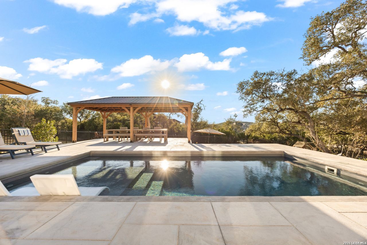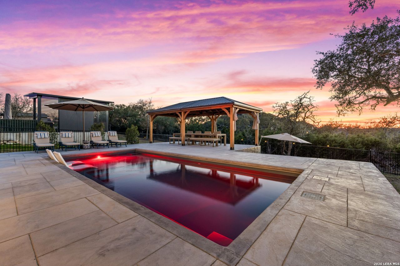 Experience elevated living in this meticulously redesigned luxury home offering panoramic Hill Country views from a premium elevated lot. Thoughtfully re-imagined by a professional architect, the enhanced open-concept floorplan provides seamless flow, expanded living spaces, and flexible functionality ideal for modern living and entertaining. Designed for todays lifestyle, this home features two private home offices perfect for remote work, a formal dining room with an elegant dry bar, and multiple spacious living areas. The expansive second-floor media room creates the ultimate entertainment space for movie nights, game days, or hosting large gatherings. High-end finishes are showcased throughout, including custom millwork, designer lighting, premium flooring, and bespoke cabinetry. The gourmet kitchen features exquisite stone countertops, abundant prep space, and curated design details that blend luxury with performance. The expansive primary suite serves as a private retreat with dual custom walk-in closets and a spa-inspired bathroom designed for relaxation. Additional living spaces offer comfort and flexibility for family and guests. Step outside to a true backyard oasis featuring a resort-style pool, extensive hardscape, and a professionally designed oversized pergola that defines luxury outdoor living. The elevated setting captures breathtaking Hill Country views, stunning sunsets, and exceptional privacy. This luxury home with pool, media room, two offices, dual custom closets, formal dining, and panoramic views offers the perfect blend of architectural design, modern functionality, and resort-style outdoor living.