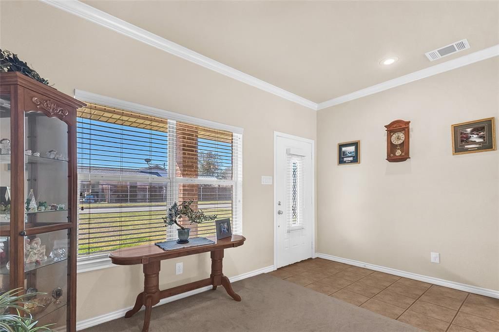 This Builder's custom designed home has been maintained to perfection and is ready for a new owner to enjoy the spacious open plan with all the upgrades. The welcoming covered front porch is waiting for your people watching and neighbor greeting comfy chairs. The Living-Dining-Kitchen Open Plan is filled with natural light and a remotely controlled electric fireplace in the living room fits beautifully in the custom built-in entertainment center, creating a cozy, relaxing atmosphere you will appreciate at the end of the day. A spacious dining area connects the living and kitchen and opens to a covered back porch where you will enjoy sipping your morning coffee or your evening cocktails. It provides additional entertaining space and is the perfect spot for grillin' and chillin'. The kitchen is a dream with granite countertops, a breakfast bar, beautiful custom cabinets and storage galore. A walk-in pantry offers even more storage. The privately located primary suite will fit your king-size bed with sitting room to spare. An ensuite bath has a separate shower, jetted tub, walk-in closets, linen closet, granite countertops and ample storage. The separate laundry room has a sink and plenty of storage. On the opposite end of the home are 2 bedrooms and a shared full bath. Strategically placed on a large 1.5 lot corner of .338 acres with a full yard automatic sprinkler system and a privacy fenced back yard, it is a great haven for nature lovers. And you will love the finished over-sized garage which will fit 2 BIG trucks. Located in a top rated school system and within blocks of shopping, restaurants, medical facilities and Hwy 175 for fast commuter access.
