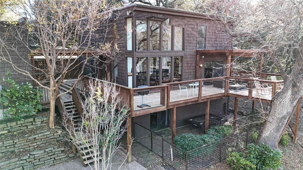 This very unique and special home sits on almost a half-acre cul-de-sac lot in Farmers Branch overlooking the serene Farmers Branch Creek, offering the feeling of a private mountain lodge surrounded by mature trees and peaceful water views. The unassuming curb appeal transforms the moment you enter through the gated entry, where the main level unfolds across an expansive deck. To the left is the inviting entrance to the home, and to the right is the detached two-car garage with additional space for motorcycles, toys, and storage. Inside, the main level features a warm family room with a fireplace and a dramatic floor-to-ceiling wall of windows framing the impressive backyard and creek. One of the primary bedrooms with its ensuite bath is conveniently located on this level. The second floor includes a second primary bedroom, a guest bedroom, and a flex room that can serve as an additional bedroom or office, as well as a loft that delivers incredible panoramic views of the lot and creek—an inspiring spot for work, relaxation, or reading. The lower level offers a large gameroom and an additional bedroom, ideal for guests or multigenerational living. The expansive wood deck provides outstanding space for entertaining while taking in the spectacular views. The generous half-acre lot gently slopes toward the creek and boasts mature trees, and plenty of grassy area for play. The detached garage also includes a second-level storage space and has the potential to be reconfigured for car enthusiasts, with high ceilings that can easily accommodate car lifts for four or more vehicles. This one-of-a-kind property is moments from 635 and 35 yet feels worlds away, offering the rare blend of convenience and a true escape to nature.