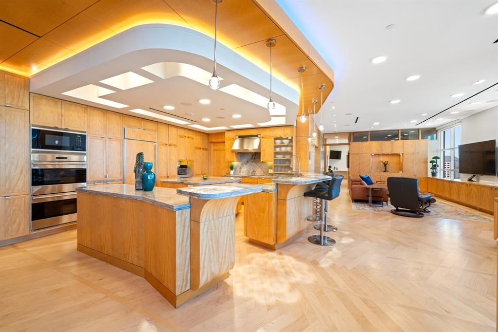Perched atop Grand Treviso, this fully renovated penthouse offers panoramic views from Frisco to the Downtown Dallas skyline. This 2-bedroom, 2-bath residence features South African Maple walls and custom cabinetry, white-ash herringbone flooring, and extensive built-in storage throughout. Bathrooms are appointed with polished stone finishes. The redesigned kitchen includes Wolf, Sub-Zero, and Fisher & Paykel appliances, plus a reverse osmosis water system. The primary suite offers sound-engineered window inserts, panoramic views, dual walk-in closets, illuminated Onyx vanity, oversized shower, separate water closet, and bidet. The guest bedroom includes an ensuite bath and built-in office space. Open living and dining areas extend to approximately 750 SF of private terrace, plus an additional covered balcony, totaling over 1,000 SF of outdoor space rarely available in high-rise properties. Grand Treviso provides 24-hour concierge, rooftop pool, fitness center, conference room, valet trash, and direct access to Lake Carolyn trails. Walking distance to Water Street and Toyota Music Factory, and minutes from DFW Airport, Love Field, and Downtown Dallas. Contact us for a comprehensive list of features and upgrades.