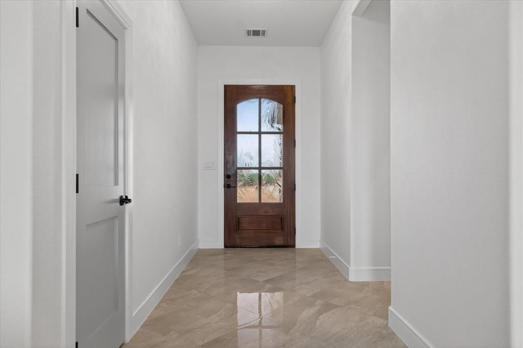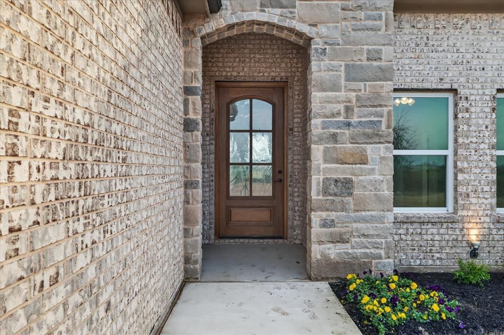 Welcome to this stunning, highly upgraded home showcasing designer finishes and thoughtful functionality throughout! Beautiful 24-inch ceramic tile flooring flows seamlessly across the main living areas, complemented by extensive recessed can lighting and abundant natural light from a wall of windows overlooking the backyard. The chef’s kitchen is the heart of the home, featuring an oversized luxury island, stainless steel appliances, glass mosaic backsplash, 42-inch cabinetry with crown molding and stacked uppers, brushed gold hardware and fixtures, pot-and-pan pullout drawers, built-in spice racks flanking the oven, soft-close drawers, trash pullout, and a striking fireclay farmhouse apron sink. An upgraded glass pantry door adds a custom touch. The spacious living area is anchored by a dramatic floor-to-ceiling tiled fireplace with a wood mantle. A functional mudroom offers built-in storage and upper cabinets, while the utility room includes a built-in sink and additional 42-inch cabinetry. Retreat to the private primary suite featuring a vaulted ceiling with wood beam accents and elegant candle-style lighting. The spa-inspired primary bath boasts a freestanding soaking tub, dual vanities, and a separate walk-in shower with floor-to-ceiling tile and upgraded stone shower floor. The oversized closet is outfitted with custom built-ins and drawers. All bedrooms include ceiling fans with light kits, and bathrooms feature smart-touch illuminated mirrors. Additional highlights include an oak front door with glass inserts, modern brushed gold fixtures throughout, epoxy garage flooring, and full gutters with integrated extensions. Enjoy outdoor living on the covered patio with a fully installed sprinkler system. This home perfectly blends luxury, style, and everyday convenience — truly move-in ready!