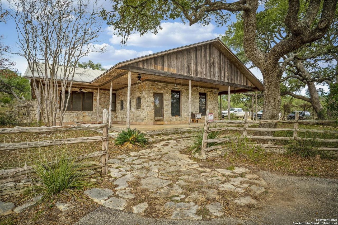 Rare 75 Acre Rustic Hill Country Ranch with Custom Rock Home - Character & Proximity Hill Country acreage of this size offering privacy and seclusion is increasingly difficult to find in this area. This approximately 75-acre ranch provides an opportunity to own a sizable tract of scenic land while remaining conveniently located approximately 20 minutes from the shops of downtown Bulverde, 35 minutes from New Braunfels and I-35, 30 minutes from Canyon Lake, approximately 40 minutes from downtown San Antonio, and about 30 minutes from San Antonio International Airport. **Main Residence & Outdoor Living** The property features a custom-built rock two-bedroom, two-bathroom home offering 1,971 square feet of living space, complemented by an approximately 600 square foot semi-wraparound patio with an added pergola. A matching custom stone two-car garage with an attached storage room is also included, along with an additional matching stone building currently used as a greenhouse and potentially adaptable for storage or other uses, subject to buyer verification. The home reflects the rustic character of its era and provides a solid foundation for future updates or renovation to suit a buyers preferences. **Distinctive Two-Story Stone Building** An additional stone structure of approximately 600 square feet is located near the main home. Originally constructed as a spur and bit collectors room, this building offers unique architectural and artistic features that contribute to the propertys Hill Country character. The main level includes a custom-built stone fireplace with a hand-carved mantel featuring a bear-head design, along with a polished concrete floor accented by a decorative inlay. One wall features a Texas-themed mural by San Antonio artist Bob Dale, adding regional character and visual interest. A walk-in vault measuring approximately 17 x 4 provides secure storage. The loft level overlooks the open floor plan and includes built-in shelving, offering flexibility for use as an office, library, studio, or guest space. This structure may offer potential for alternate uses, including guest accommodations, subject to buyer verification of permitted use and suitability. **Additional Improvements & Land Features** A water well located near a wet-weather creek supplies water to a pressure tank serving the propertys improvements. The rear portion of the ranch is heavily wooded, contributing to a secluded Hill Country setting that supports native wildlife commonly found in the region, including white-tailed deer and turkey (wildlife presence not guaranteed). The natural terrain and mature tree cover enhance recreational use and privacy. Additional improvements include an approximately 4,550 square foot barn with older working pens. Various antique ranch implements remain on the property and contribute to a classic Western and Hill Country ranch atmosphere. Buyers should note that some