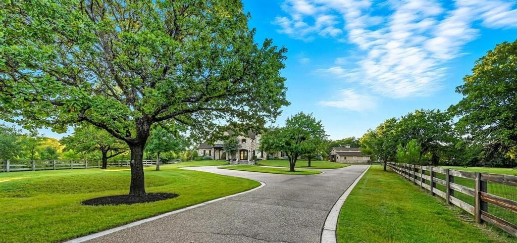 PICTURESQUE 3-ACRE ESTATE WITH A LUSH BACKYARD SANCTUARY, BARN & 4-CAR GARAGE! The foyer welcomes you with a chandelier & flows into a living area with a wall of windows overlooking the backyard & pool. A Texas-style office with Mediterranean flair sits off the foyer, offering French door views of the front acreage. Brick & stone features highlight the inviting feel of the open family room & breakfast area, with a formal dining room for special occasions. Host in the gourmet kitchen featuring high-end appliances, a gas cooktop, center island with a prep sink, bar seating, walk-in pantry, butler’s pantry & a wine room with an Avanti fridge & space for nearly 200 bottles. Pamper yourself in the lavish primary suite showcasing a double tray ceiling, fireplace & a massive walk-in closet with a chest of drawers, plus a spa-like bath offering a jetted tub with stylish columns, a dual-head shower & separate vanities. Upstairs, enjoy a huge game room with a wet bar area, a private media room designed for theater style seating, a balcony with elevated views & three secondary bedrooms. The outdoor elements of this home make it a truly unique find! Drive up from the road appreciating the lush trees & ranch-style fencing that leads to a huge pasture for horses or family exploration. The modern barn with four stalls & a tack room invites horses or any other use on this spectacular property. The backyard is your personal wonderland for quiet time or entertaining, boasting a large saltwater pool with a black stone bottom, an eight-foot deep end, fountain, water feature & spa. A new gas grill & broad space for seating guarantees memories to last a lifetime. Surrounding greenery offers privacy & a getaway from the rest of the world. Fantastic location down the street from Rocky Point Trail, an equestrian trail, with easy access to Lake Grapevine & the popular Northshore Trails featuring 22+ miles for hiking, biking & walking. Click the Virtual Tour link to see the 3D Tour!