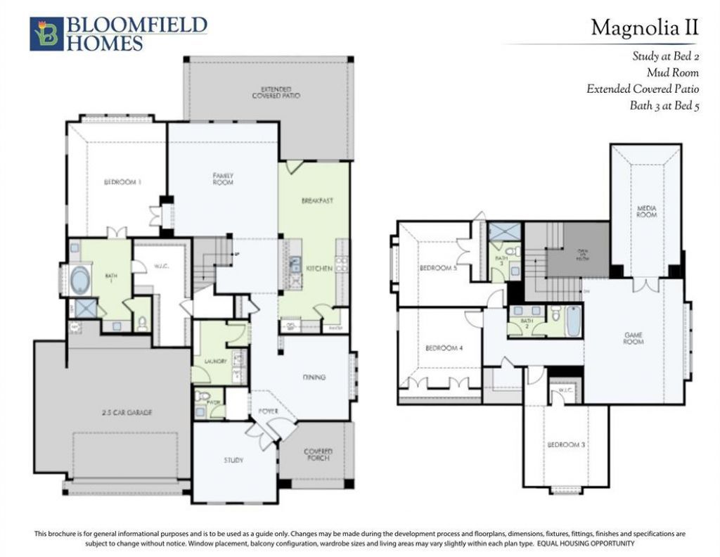 *$10K towards closing costs regardless of lender!* NEW! NEVER LIVED IN! Estimated completion April 2026. Located in the Grand Heritage community, the Magnolia II by Bloomfield Homes features 4 bedrooms, 3.5 baths, and a 2.5-car garage with an extended driveway in a spacious two-story home. The first floor sets the tone with wood-look tile flooring through the main living areas and a welcoming covered front porch. Near the entry, a private study with glass French doors sits across from the dining room. The family room flows naturally into the breakfast area and kitchen, creating one open living space. The Deluxe Kitchen pulls its weight with quartz countertops, Shaker-style cabinets, a convenient trash can pull-out, and built-in stainless steel appliances. Even better, the refrigerator and blinds are included for FREE, making move-in that much easier. A mud room helps keep everyday life organized, and comfort-height toilets add a practical touch throughout the home. The primary suite is located downstairs and features a spacious bath with a large walk-in closet, separate vanities each with a sink, a garden tub, and a shower. Upstairs is where the home really opens up. A large game room sits at the center of the second level, with a dedicated media room ready for movie nights or weekend game days. 3 additional bedrooms and 2 full baths complete the upper floor, along with a balcony that offers a unique outdoor space to relax. Out back, the extended patio creates the perfect spot for grilling or gathering with friends. Full rain gutters and a tankless water heater add efficiency and long-term performance. Life in Grand Heritage means weekends well spent. Residents enjoy 2 community pools, parks, playgrounds, trails, fishing ponds, a clubhouse for events, and a a fitness center just minutes from home. Visit Bloomfield Homes in Grand Heritage to see why the Magnolia II continues to be a favorite floor plan!