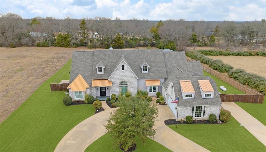 Built in 2015, this beautiful modern contemporary home is located in Stone Ridge Estates and sits on over 1.6 acres. A concrete circular drive enhances curb appeal and provides ample space for gardening, recreation, or the addition of a pool. The home offers five bedrooms—plus a media-game room—along with four full bathrooms, 3 fireplaces, formal living and dining rooms, and an open-concept kitchen, dining, and family room ideal for entertaining. The custom kitchen offers stainless appliances including refrigerator and trash compactor, custom cabinets, center work island, gas cooktop, double oven, and warming drawer. Additional features include a built-in dining booth, tall ceilings and crown molding throughout. The primary suite features a sitting area with built-in cabinetry, sink, and refrigerator, as well as an ensuite bath with a separate shower, jetted tub, dual vanities, and an oversized walk-in closet. Outdoor amenities include a screened-in porch, wood deck, and a 20x40 metal shop suitable for ATVs or a boat. This custom home offers exceptional space and versatility for a variety of lifestyle needs.