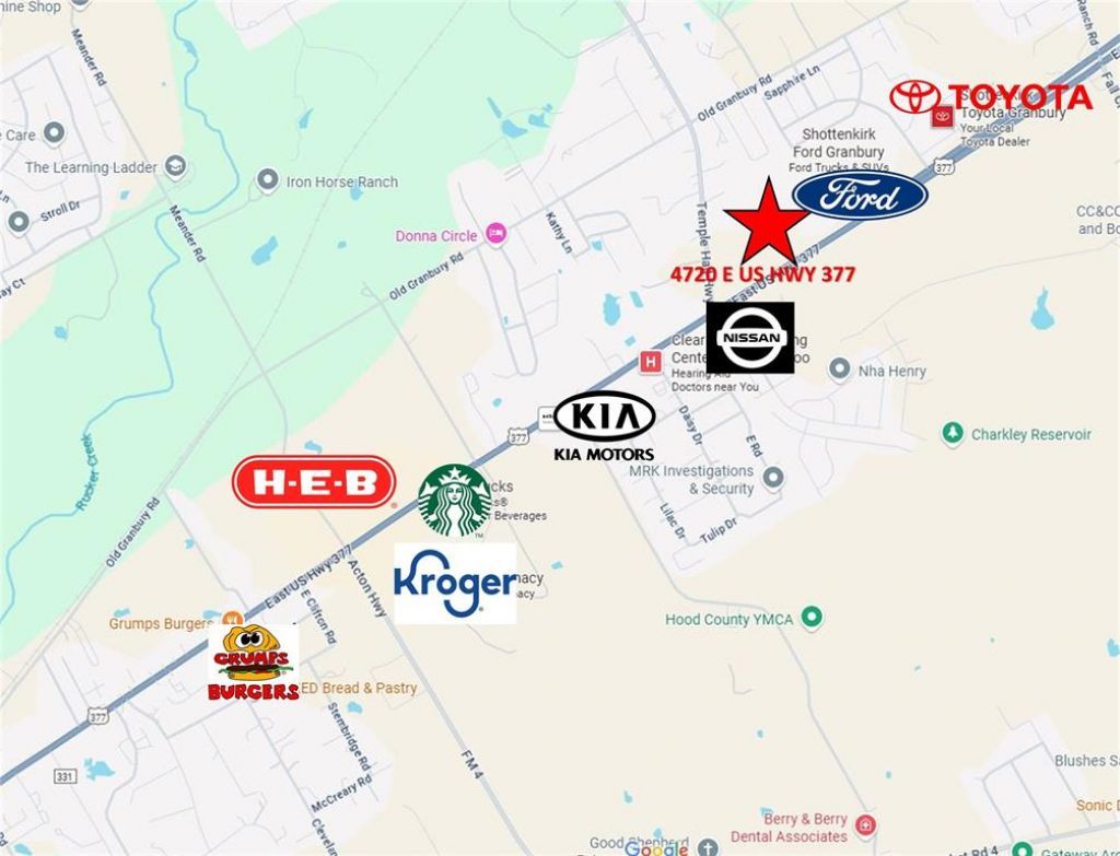 Incredible opportunity to own a high-visibility commercial tract in the heart of Granbury, Texas — voted the Best Historic Small Town in America. This property offers over 350 feet of direct frontage on Highway 377 with an estimated daily traffic count exceeding 25,000 vehicles, making it a premier location for any commercial development. Situated within Granbury city limits, this parcel is ideally positioned between major national retailers and automotive dealerships. Just east of HEB, Kroger, Starbucks, Marshalls, and Granbury Nissan & Kia — and west of Ford, Hyundai, Jeep, and Toyota dealerships — your future business will be in thriving company. Surrounded by several new and expanding residential subdivisions, this property benefits from a strong customer base and exceptional long-term growth potential. Mature oak trees offer natural beauty and shade, while the rectangular shape and level topography provide flexible design options for development. Ideal for a variety of commercial uses, including, Automotive Sales, Gas Station, Office Building, Church, Industrial, Manufacturing, Warehouse or Distribution Center. Don’t miss your chance to secure a rare, high-traffic location in one of Texas’ most desirable small-town markets. This is THE spot for your next business endeavor.