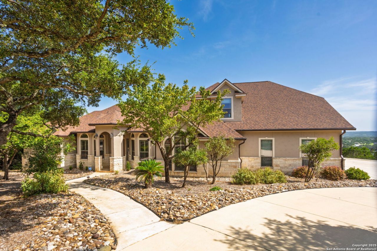 Tucked away in a quiet cul-de-sac, this meticulously maintained, one-owner home offers sweeping views for miles and exceptional privacy surrounded by mature trees. Thoughtfully designed living space, this home features a flexible layout with a dedicated office, elegant library with built-in bookcases, and a spacious game room. Enjoy breathtaking scenery from oversized full back of home patio, or the upstairs balconies (PLURAL). The main level includes the primary bedroom, a secondary bedroom with an en suite bath, a stately library, private office, and a convenient half bath. Upstairs youll find two additional bedrooms, a full bath, and a large game room complete with built-in sink and beverage fridge, ideal for entertaining or movie nights. The kitchen boasts brick accent details that add warmth and character, double ovens, and ample cabinetry, while unique accent windows throughout the home bring in natural light and architectural charm. The side-entry 3-car garage offers great curb appeal and functionality. With thoughtful custom finishes, peaceful surroundings, and plenty of room to roam, this home perfectly blends luxury, comfort, and Hill Country charm.