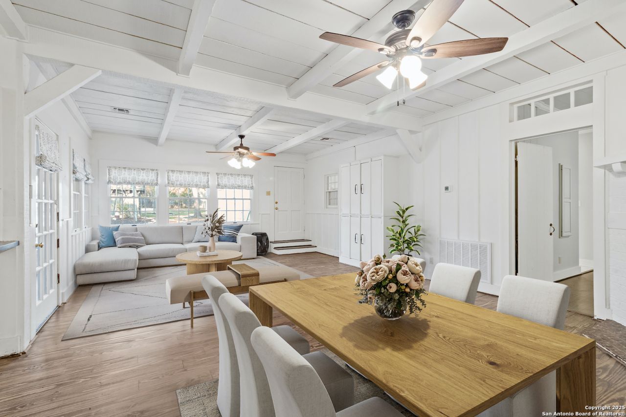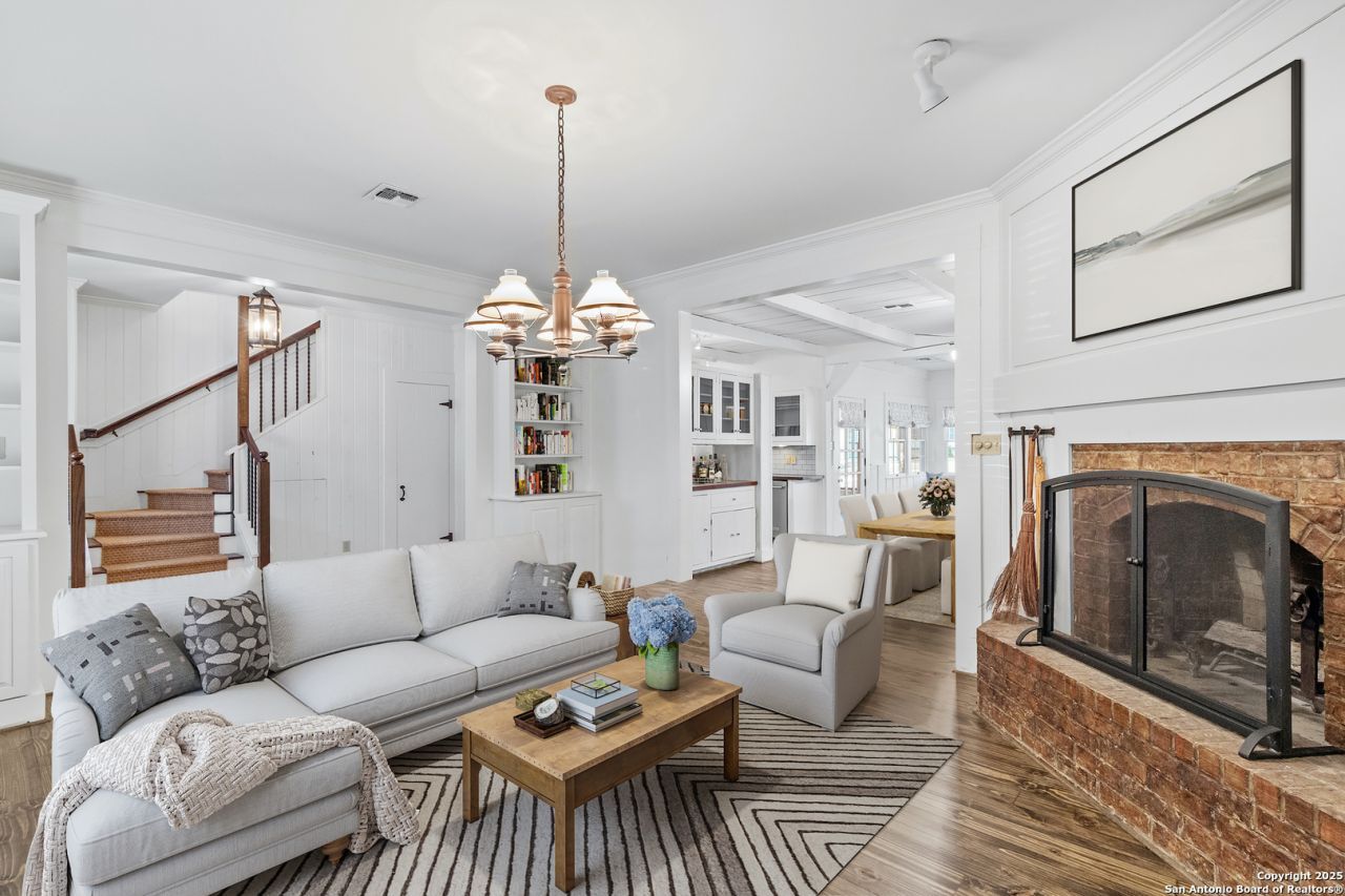 A block off Main St, this charming Fredericksburg home captures the timeless appeal & relaxed lifestyle that make the historic town so loved. Designed in the "Sunday Haus" tradition, it offers vintage-inspired details including built-ins & beamed ceilings. A circular drive welcomes guests, while a gated drive leads to the attached 2-car garage tucked behind the home. Mature shade trees, stone walkways & deep front porch invite you to slow down & enjoy life. Inside, open flow living & dining rooms each feature a brick fireplace. The charming kitchen features SS apps, 5-burner gas cooktop, subway tile backsplash, wood counters & glass-front cabinetry. Main-level primary suite features a fireplace, dual baths w/showers (one w/ clawfoot tub), WI closet & outside access. A powder room, laundry & screen porch round out the main level. Upstairs offers 2 spacious guest rooms, full bath, lg landing w/access to exterior stairs. A clever hatch blocks the upper level when not occupied. A delightful guest cottage w/screened porch provides extra space w/living area, full kitchen, bath, built-in bunks & large bedroom. Outdoor spaces include pea-gravel seating area, raised garden beds & lg yard.