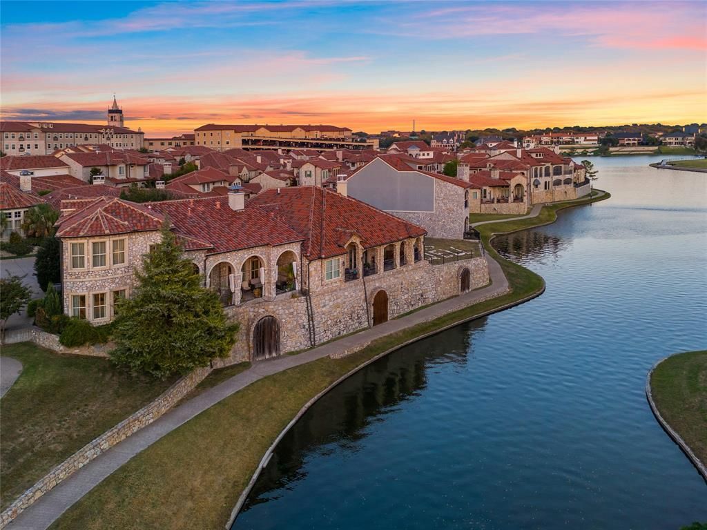 Welcome to Adriatica Village-step into another world, a quaint European village full of beautiful views, unique architecture, cobblestone streets and quality construction with walkability in a mixed use environment including 7 restaurants all within the neighborhood. 6821 Dalmatia is a waterfront villa, full of character beginning with the tranquil courtyard entrance, arched iron door and front Juliet balcony. You'll love the high end finishes yet low maintenance lifestyle this zero lot water view home provides. The main level features travertine stone tile flooring in all main areas, a massive cast stone gas log fireplace, beamed ceiling, wood & stone staircase & a wall of windows overlooking the 34X9 water view balcony. The custom granite kitchen features drawers instead of cabinets for convenience, a Wolf commercial 6 burner gas cooktop, double ovens, custom vent hood, Sub Zero built in fridge, long bar & walk in pantry. The primary bedroom has a sitting area, jet tub, double vanities, pocket doors, 3 tier walk-in closet with built-in dresser. Upstairs is all hardwood with tile in wet areas, 2 bedrooms with connecting shared bath and a Texas basement walk in attic. Other extras include: tankless water heater, 8ft solid core doors, custom leathered granite vanity in powder bath, 14ft ceilings, door jamb light switches, pocket doors, foam encapsulated insulation, fire suppression system, fresh air intake, patio gas grill connection & storage closet. Oversize 2 car garage. Lavishly landscaped. Enjoy superb quality George Fuller construction along with a lock and leave lifestyle and resort water view setting every day. Stonebridge amenities include an aquatic center, tennis, pickleball, parks, lakes, catch & release fishing and trail system. YOU deserve to live your life in this luxury and character.