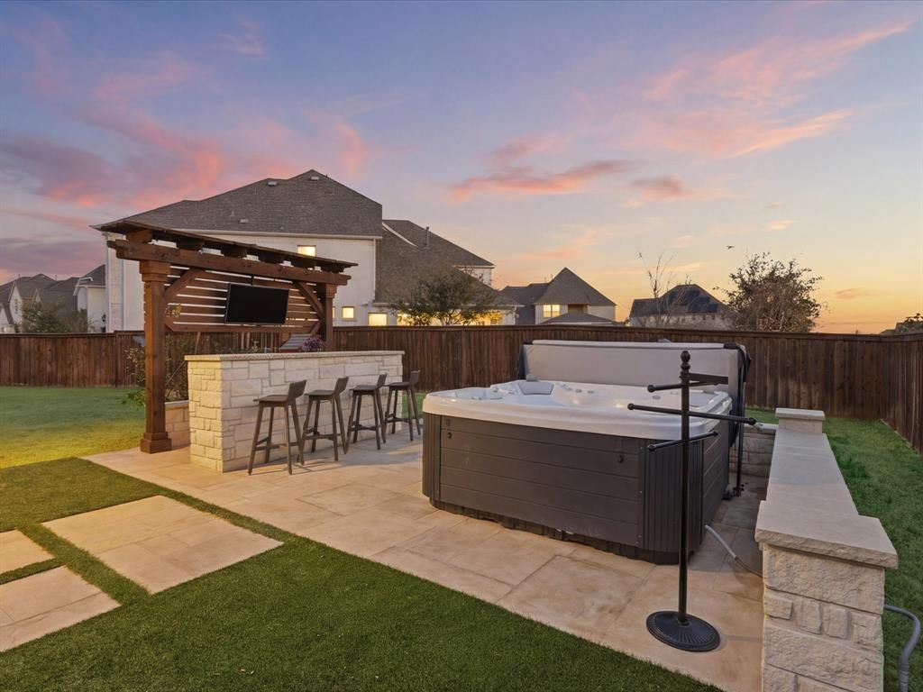 Welcome to the showstopper you’ve been waiting for in one of Frisco’s most sought-after communities. This exceptional 4 bed, 5 bath, 3-car garage home blends elevated design with effortless functionality, featuring soaring ceilings, an open-concept layout, and abundant natural light. Designer lighting, statement wallpaper, and custom millwork create a refined yet inviting atmosphere throughout. Just off the entry, a private study offers the perfect work-from-home space, while the elegant dining room provides a beautiful setting for gatherings and celebrations. A convenient downstairs powder bath adds comfort for guests. The gourmet kitchen is the heart of the home, highlighted by a stunning quartz island, double ovens, gas cooktop, and abundant cabinetry. The living room makes a dramatic impression with a floor-to-ceiling stone fireplace and a wall of windows with custom treatments overlooking the backyard oasis. The private primary suite offers a true retreat with a spa-inspired bath complete with a soaking tub, frameless glass shower, dual custom vanities and an incredible custom Closet by Design system. A spacious downstairs guest ensuite provides privacy and comfort for visitors. Upstairs features two generously sized bedrooms, two full baths, an additional powder bath and a media room perfect for movie nights. The loft space, complete with a bar and mini-fridge, accented with designer wallpaper and statement lighting, overlooks the main living area and serves beautifully as a game room, playroom or flex space. Step outside into your lifestyle backyard featuring custom tilework, turf, a stone fireplace with seating area, a Wellis luxury hot tub and tv area, and generous green space to relax or entertain. Located in award-winning Frisco ISD and the highly coveted Phillips Creek Ranch community, this home offers not just a place to live, but a lifestyle.