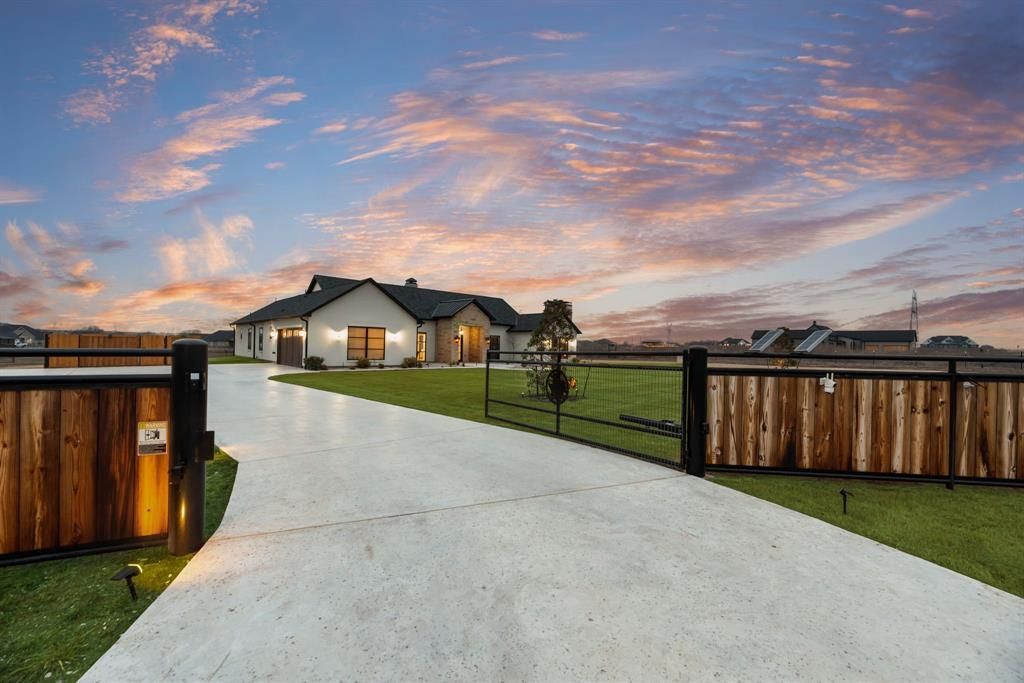 Welcome to an extraordinary, fully custom ranch style estate offering the pinnacle of luxury living in Krum, ideally situated on a quiet cul-de-sac and set on 2+ acres of beautifully landscaped land. This stunning residence features 4 bedrooms, 4.5 bathrooms, and two expansive family rooms designed for both refined everyday living and grand-scale entertaining. The chef’s kitchen is a true work of art, showcasing a sleek double panel built in refrigerator and freezer, an oversized walk-in pantry, premium appliances, and exquisite custom finishes throughout. The main living space is anchored by a dramatic two sided, floor to ceiling fireplace, creating an elegant focal point that flows seamlessly between living areas. Custom floating shelves and expansive sliding doors open to a private backyard oasis, perfectly blending indoor and outdoor living. The luxurious primary suite is a serene retreat, complete with its own striking fireplace and spa inspired ambiance. Additional highlights include a underground storm shelter for peace of mind, a whole home water softener, and a fully fenced property secured by a custom motorized gate, offering privacy, convenience, and exclusivity. Every detail of this home is completely custom, reflecting superior craftsmanship, timeless design, and an unparalleled lifestyle in a peaceful acreage setting.