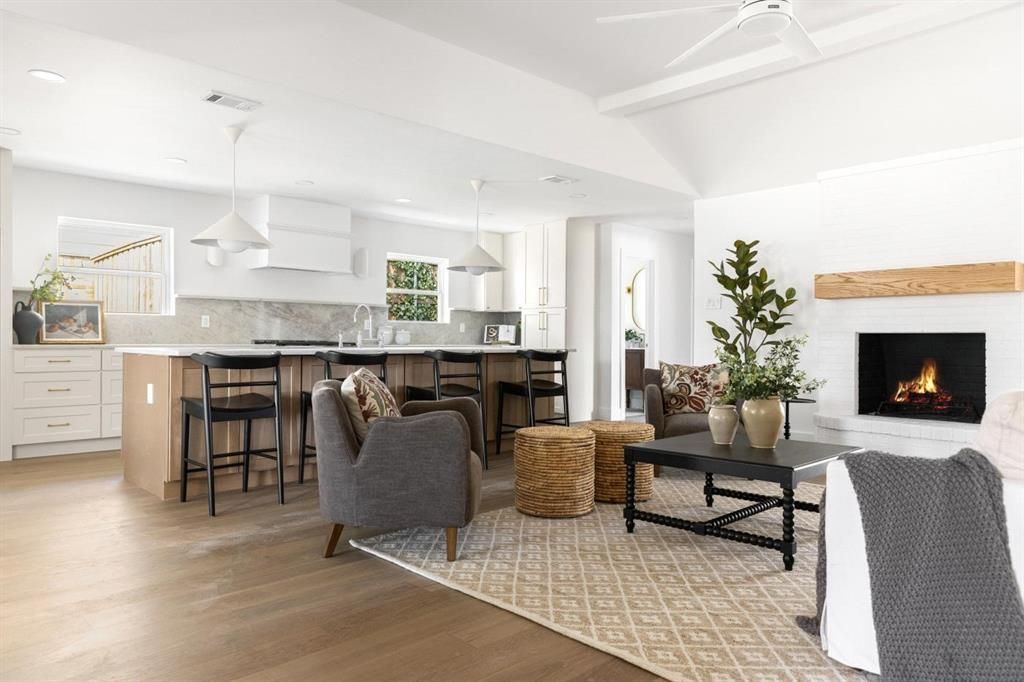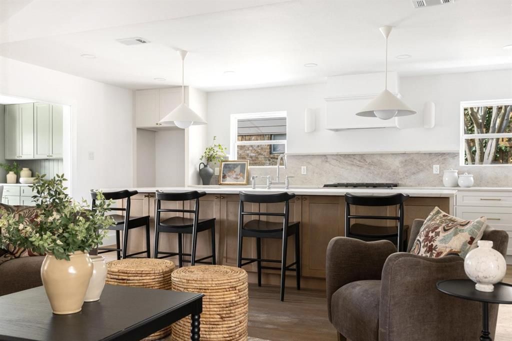 Beautifully renovated and thoughtfully reimagined by Maverick Design, this exceptional 5-bedroom, 2.5-bath residence blends timeless style with modern comfort in every detail. The heart of the home is a spacious, light-filled kitchen designed for both everyday living and effortless entertaining. Featuring a large center island, abundant storage, new appliances, and designer lighting, the kitchen seamlessly overlooks the inviting living room complete with a statement fireplace and vaulted ceiling that enhances the open, airy feel. Just off the kitchen, a generously sized dining room offers built-in cabinetry and the perfect setting for hosting gatherings or enjoying family meals. The private primary suite serves as a tranquil retreat, highlighted by a spa-inspired ensuite bath with dual vanities and an expansive double shower. Secondary bedrooms are spacious and versatile, ideal for family, guests, or a home office setup. Additional features include a functional laundry room and a covered patio that overlooks the fenced backyard—perfect for relaxing evenings or weekend entertaining.