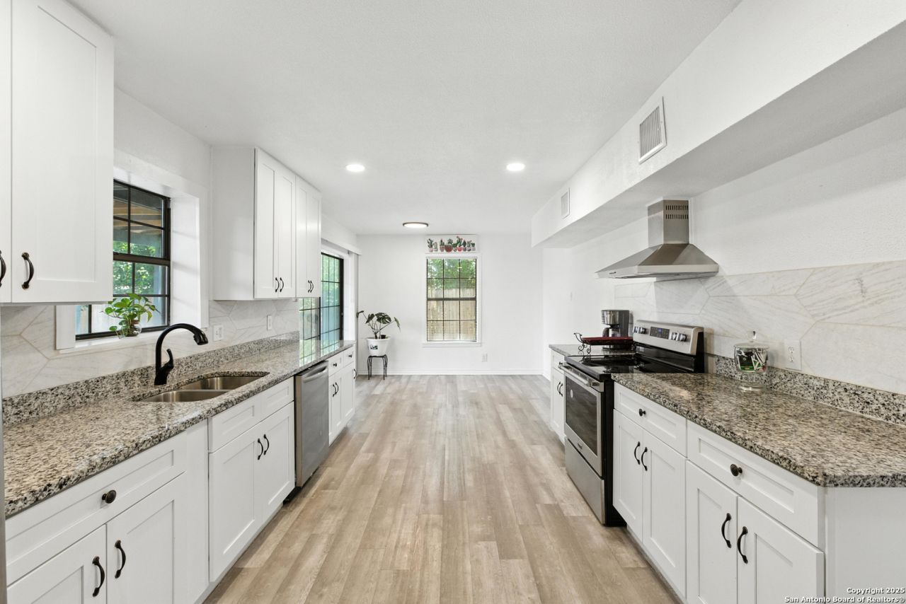 Beautifully renovated and move-in ready, this spacious two-story home offers the flexibility and features todays buyers are looking for-plus the freedom of no HOA. The main level includes a bright open-concept living and dining area with skylights and large windows that let in abundant natural light. The updated kitchen boasts granite countertops, crisp white cabinetry, and stainless steel appliances, with an oversized sliding glass door leading to the backyard for effortless indoor-outdoor flow. One bedroom is located downstairs with a full bathroom nearby, making it ideal for guests, a home office, or multigenerational living. Upstairs, the oversized primary suite features a private walk-out balcony and a refreshed en-suite bath. Two additional bedrooms and a third full bath complete the upper level. Additional highlights include a newer roof, HVAC, water heater, and appliances, along with a rare 3-car garage, extended driveway, and nearly quarter-acre lot with mature trees and a fully fenced yard. Conveniently located near I-35, Loop 1604, shopping, and Randolph AFB, this home offers style, space, and convenience-with no HOA restrictions.