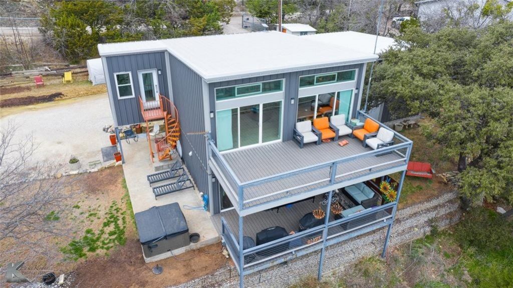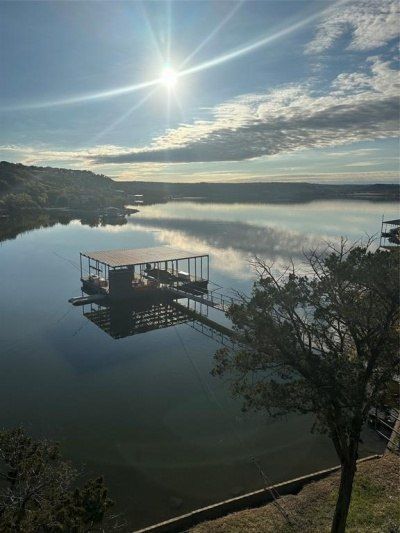 WATERFRONT HOME WITH EFFICIENCY APARTMENT! This stunning 2 bedroom 2 full bath multi level home with small efficiency apartment over garage has it all! Modern design with industrial touches add charm and character to this waterfront property on gorgeous Possum Kingdom Lake. Main and second level decks offer unobstructed views for sunrise morning coffee or peaceful lake nights. There is a wealth of natural light and breath taking views from primary bedroom, living room, and kitchen area. Primary bedroom has coffee bar with LG tower washer dryer combo. Second bedroom has Murphy bed with storage for hanging clothes. EXTRA BONUS is the 450 Sq. ft. multi level Efficiency apartment in garage. Private path to boat dock with custom made furniture for lake living at its best. Dock boast 2 slips with electric boat lift and hydro hoist, a jet ski dock and mooring whips to facilitate guest boats. Dock also has attached light for off the dock night fishing. Don't miss out on this piece of paradise! Enjoy the view and quiet slower paced side of PK Lake. CLICK ON VIRTUAL AND VIEW YOUTUBE DRONE VIDEO!