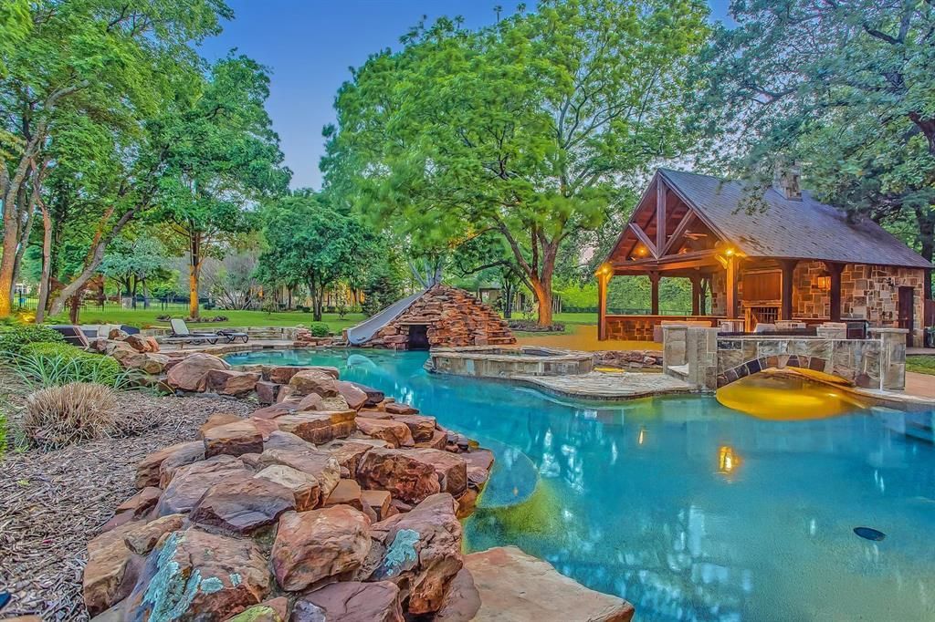 Unmatched beauty in the prestigious guarded and gated golf community of The Estates at Tour 18. This private escape sits on a heavily treed lot and offers a resort style outdoor living area designed for fun and effortless entertaining. The peaceful estate rests on almost two wooded acres and includes a sparkling pool with lazy river, a pool house with shower and half bath, a mosquito misting system, a putting green, fire pit, and a richly appointed outdoor living and kitchen area with bar and sound system. The main house has been exquisitely updated and welcomes you with an impressive entry, vaulted ceilings, designer finishes, and light filled open spaces that will wow your guests. The primary closet is a must see to fully appreciate. Other features include an oversized driveway for extra parking and basketball, in-ground tornado shelter, full-house generator, roof replaced in 2025, Christmas light ready, and lighting grounding rod. Many features are smart-home enabled, such as the HVAC system, pool, alarm system, garage doors, entry lock, sprinkler system, and indoor outdoor sound system. Served by award winning Argyle ISD with close proximity to Liberty Christian School and UNT.