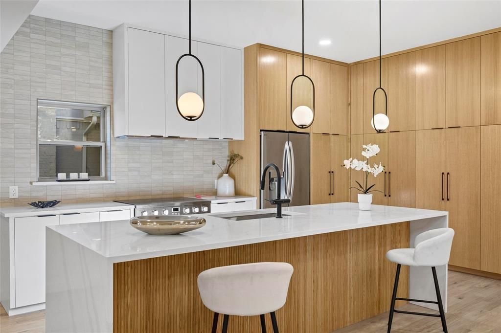 Completely reinvented and thoughtfully updated, this stunning 4-bedroom, 3-bath home blends iconic MCM architecture with refined modern finishes. This White Rock North home has clean lines, open living spaces, and custom lighting create a bright, elevated feel throughout.Enjoy oak hardwood floors across the home, Porcelanosa tile in designer spaces, and a show-stopping kitchen featuring custom white oak cabinetry and stainless steel appliances. The spacious primary suite offers a spa-inspired en suite bath with dual sinks and bespoke tile work, while a cedar closet adds a rare, luxe touch.Step outside to a huge backyard with a rolling gate—perfect for entertaining, play, or future expansion. This is a true architectural statement, reimagined for modern living in one of East Dallas’ most sought-after pockets of Lake Highlands.