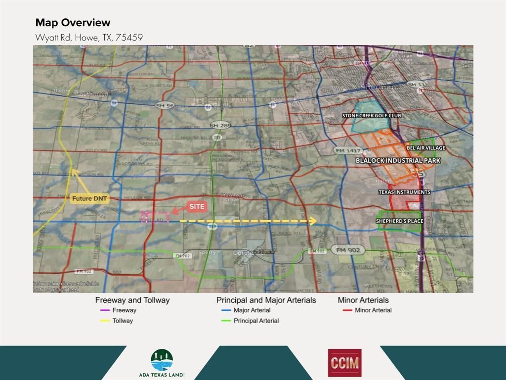 Outstanding opportunity to acquire a strategically located site positioned for long-term value creation in a high-growth corridor of North Texas. The offering consists of three contiguous parcels, available for purchase individually or in combination.The property features approximately 3,800 feet of frontage along future Major Arterial Wyatt Road, which will serve as a key connector to U.S. Highway 75, the planned Dallas North Tollway (DNT) extension (2.3 miles away), and the upcoming 500+ acre mixed-use development, The Shepherd’s Place.Additionally, the future Minor Arterial Fallon Road is planned to intersect the site, introducing an additional access point and further enhancing the property’s visibility and utility for future development.Located within minutes of major employment centers, including Texas Instruments and Blalock Industrial Park, the site offers excellent access to labor, logistics, and regional transportation infrastructure.Survey available. The information provided herein has been compiled from sources believed to be reliable; however, no warranty or representation is made as to its accuracy or completeness. All property information is subject to errors, omissions, changes in price, prior sale or lease, and withdrawal from the market without notice.
