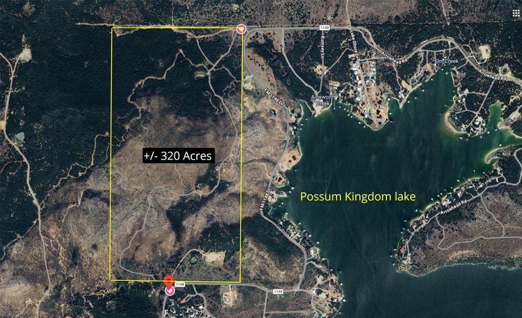 An exceptional opportunity to acquire 320± acres overlooking Possum Kingdom Lake in the heart of Palo Pinto County, featuring Caudill Mountain, a named county summit rising to approximately 1,360+ feet in elevation. This unique high point offers commanding views of Possum Kingdom Lake on one side and a sweeping valley panorama on the other, creating a rare dual-aspect vantage seldom found on privately held ranch land.The property showcases dramatic topography with rolling hills, rugged slopes, elevated ridgelines, and scenic high points that provide expansive views from multiple locations. Native oak, mesquite, and cedar blend with open pasture and grassed areas, delivering both visual appeal and functional grazing capacity. Two established stock tanks and a water tap enhance the ranch’s recreational and agricultural utility, supporting wildlife and livestock operations. The property benefits from an existing agricultural exemption and is well-suited for cattle operations, hunting, recreational use, and future residential development. The ranch also includes a cellular communications tower generating approximately $500 per month in rental income, with all electrical service and related utility costs paid by the tower operator, providing supplemental passive revenue. With approximately 2,000 feet of FM road frontage, access is provided via an all-weather road and available co-op electric service. The ranch is unzoned and unrestricted, allowing flexibility for a private estate, legacy ranch, recreational retreat, or long-term investment holding. Wildlife is abundant, including whitetail deer, hogs, dove, ducks, and native game species. The varied terrain and vegetation create diverse habitat and natural cover throughout the property. This is a rare opportunity to own a landmark-quality ranch centered around one of Palo Pinto County’s signature high points—offering elevation, views, privacy, income potential, and versatility in a premier Possum Kingdom Lake setting.